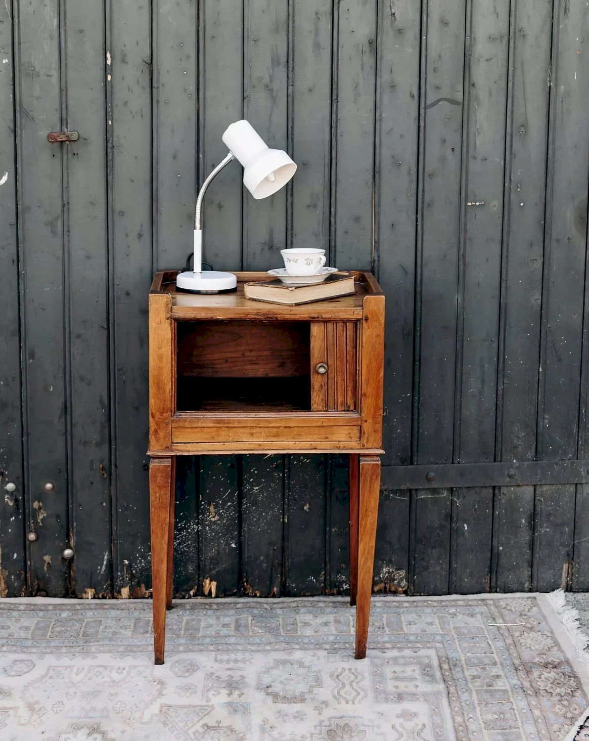 Authentic and charming, this wooden bedside table captivates with its retro design and carefully crafted details. It features a niche closed by a sliding door, elegant tapered legs, and a refined edge on the top. Its round brass handle adds a vintage touch, while some signs of wear highlight its unique character and history. A piece of furniture that is both practical and decorative, ideal for adding charm to your bedroom. Length: 43 cm Height: 74 cm Depth: 32 cm Height of the niche: 17 cm A brief history of the bedside table The term "bedside table" has referred to a small piece of furniture placed next to the bed since the Middle Ages. Initially designed as a support for a lamp or personal items, the bedside table has evolved over time to include drawers and shelves. Essential in the bedroom, it now combines functionality and design, adapting to all interior styles. Condition: Used: Item has been used. Item shows some superficial signs of wear, fully operational and functioning correctly. It may be a display model or an item returned to the store after a short period of use, with any possible imperfections. Brand: Debongout Type: Vintage product Material: Wood Customizable: Bedside tables Style: Country