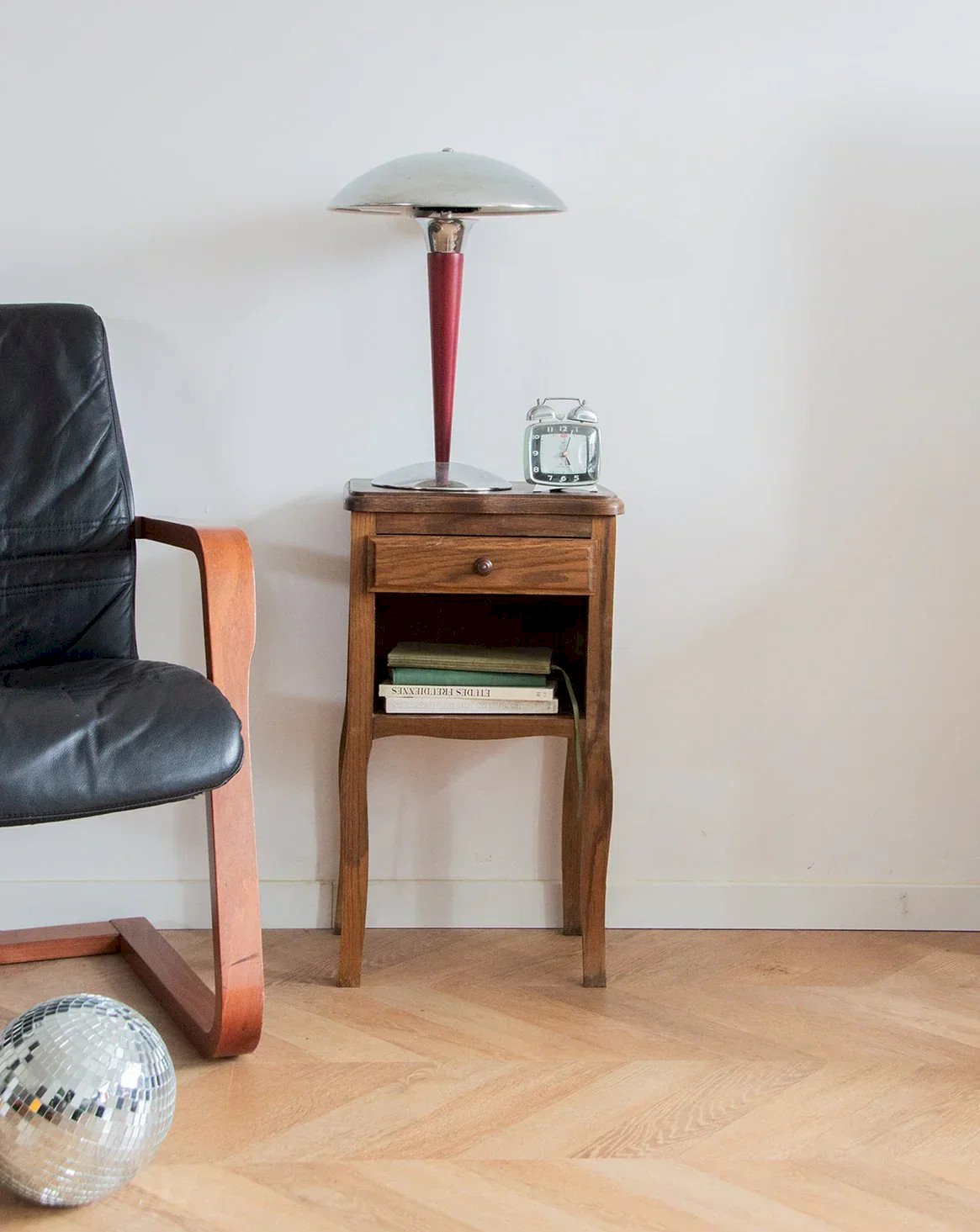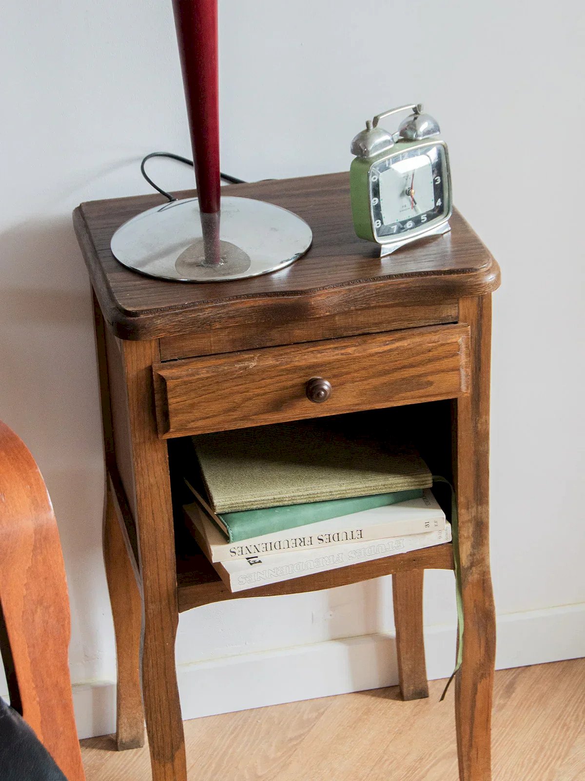 Discover this charming little wooden nightstand, which combines elegance and practicality. With its intricately designed legs and vintage style, it will bring a warm touch to your bedroom. It features a small drawer and a compartment for optimal storage. The signs of wear on the top add character to the piece, making this nightstand a unique item with a story to tell. Length: 37 cm Width: 28 cm Height: 66 cm Drawer height: 5 cm Niche height: 16 cm A brief history of the nightstand The term "nightstand" has referred to a small piece of furniture placed next to the bed since the Middle Ages. Initially designed as a support for a lamp or personal items, the nightstand has evolved over time to include drawers and shelves. Essential in the bedroom, it now combines functionality and design, adapting to all interior styles. Condition: Used: Item that has been used. Item showing some superficial signs of wear, fully operational and functioning correctly. It may be a display model or an item returned to the store after a short period of use, with potential imperfections. Brand: Debongout Type: Curated product Material: Wood Customized: Nightstands Style: Country