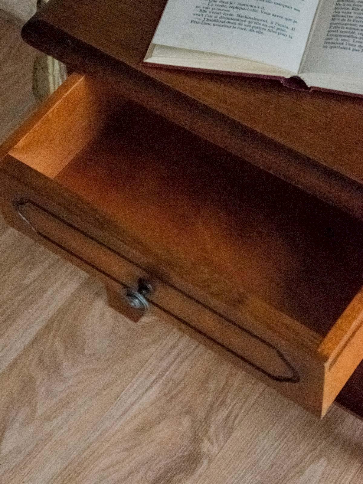 Adopt this small wooden bedside table, with a compact format and simple lines, designed to blend discreetly into a cozy bedroom. Its drawer and niche provide practical storage for a lamp, books, and everyday items, while its balanced proportions suit both small spaces and minimalist interiors. The wood radiates a gentle warmth and natural brightness that complement raw materials and neutral shades. Some signs of wear are present. Length: 50 cm Width: 33 cm Height: 53 cm Drawer height: 8.3 cm Niche height: 30 cm A brief history of the bedside table The term "bedside table" has referred to a small piece of furniture placed next to the bed since the Middle Ages. Initially designed as support for a lamp or personal items, the bedside table has evolved over time to include drawers and shelves. Essential in the bedroom, it now combines functionality and design, adapting to all interior styles. Condition: Used: Item has been used. Item shows some superficial signs of wear, ...Used: Item has been used. Item shows some superficial signs of wear, fully operational and functioning correctly. It may be a display model or an item returned to the store after a short period of use. Any imperfections. Brand: Debongout Type: Vintage product Material: Wood Style: Country Customizable: Bedside tables.