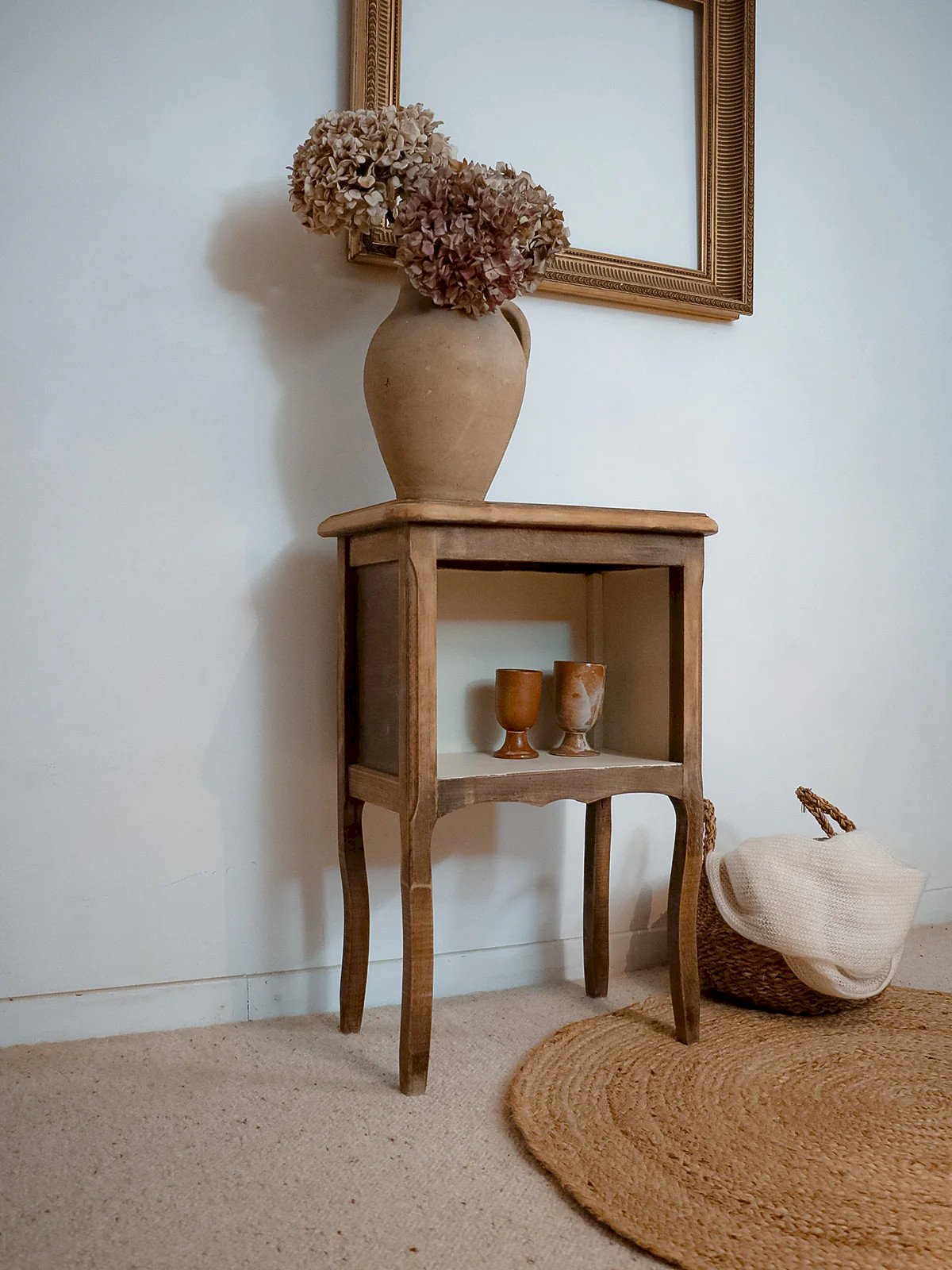 Adopt this dark wood bedside table with delicate lines, set on four curved legs that give it a light and elegant silhouette. Its integrated beige niche offers discreet storage for books and night items, while its thoughtfully designed proportions perfectly fit small spaces. The combination of the dark wood hue and light accents creates a warm and refined atmosphere, ideal for a bedroom with a simple and welcoming style. Length: 46 cm Width: 28 cm Height: 69 cm A brief history of the bedside table The term "bedside table" has referred since the Middle Ages to a small piece of furniture placed next to the bed. Initially designed as a support for a lamp or personal items, the bedside table has evolved over time to include drawers and shelves. Essential in the bedroom, it today combines functionality and design, adapting to all interior styles. Condition: Used: Item has been used. Item shows some superficial signs of wear, fully operational and functioning correctly. It may be a demonstration model or an item returned to the store after a short period of use, including any imperfections. Brand: Debongout Type: Antique product Material: Wood Custom: Bedside tables Style: Country