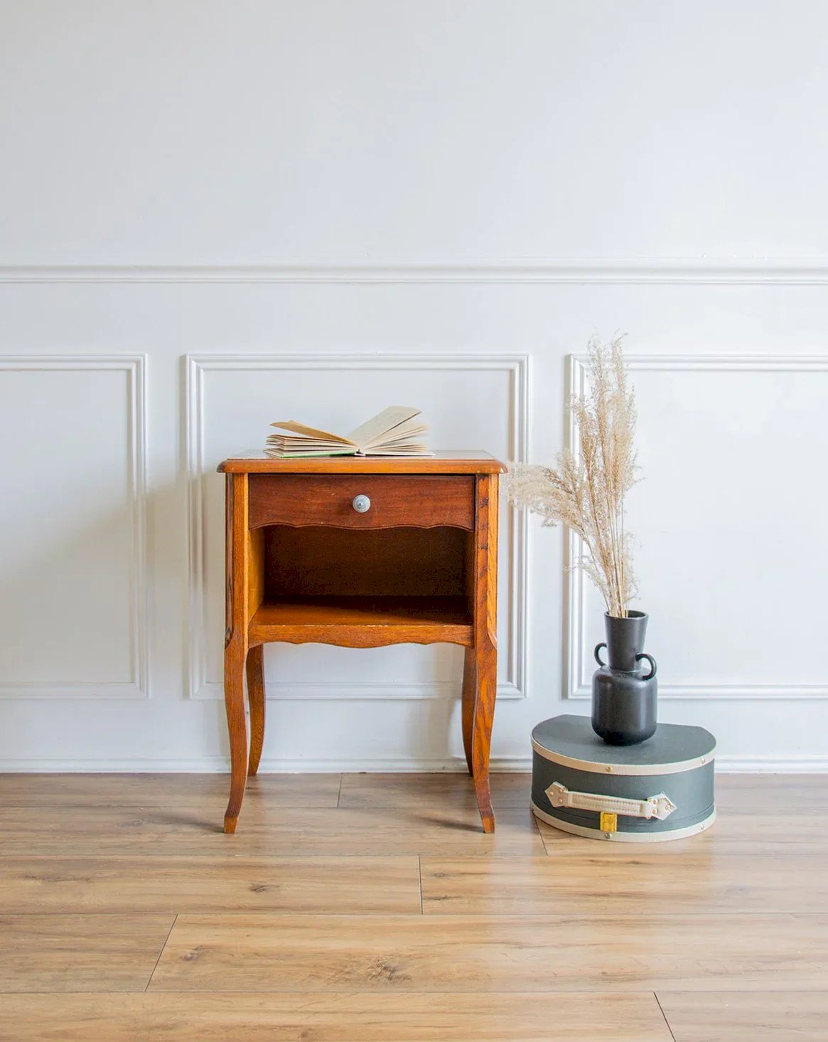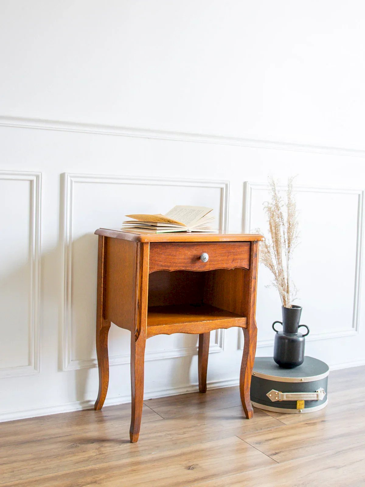 Discover this elegant wooden bedside table, perfect for adding a warm touch to your bedroom. It features a practical drawer and a niche for simple and efficient storage. The lovely details of the wood and its natural grain add character to this piece. Its curved legs bring a note of charm and softness to the design. Some signs of wear inside the drawer testify to the charm of its history. Length: 45 cm Height: 57.5 cm Drawer height: 7 cm Depth: 29 cm A brief history of the bedside table The term "bedside table" has referred since the Middle Ages to a small piece of furniture placed next to the bed. Originally designed as a support for a lamp or personal items, the bedside table has evolved over time to include drawers and shelves. Essential in the bedroom, it today combines functionality and design, adapting to all interior styles. Condition: Used: Item that has been used. Item showing some superficial signs of wear,...Used: Item that has been used. Item showing some superficial signs of wear, fully operational and functioning correctly. It may be a demonstration model or an item returned to the store after a short period of use. the possible imperfections. Brand: Debongout Type: Thrifted product Material: Wood Style: Country Customized: Bedside tables