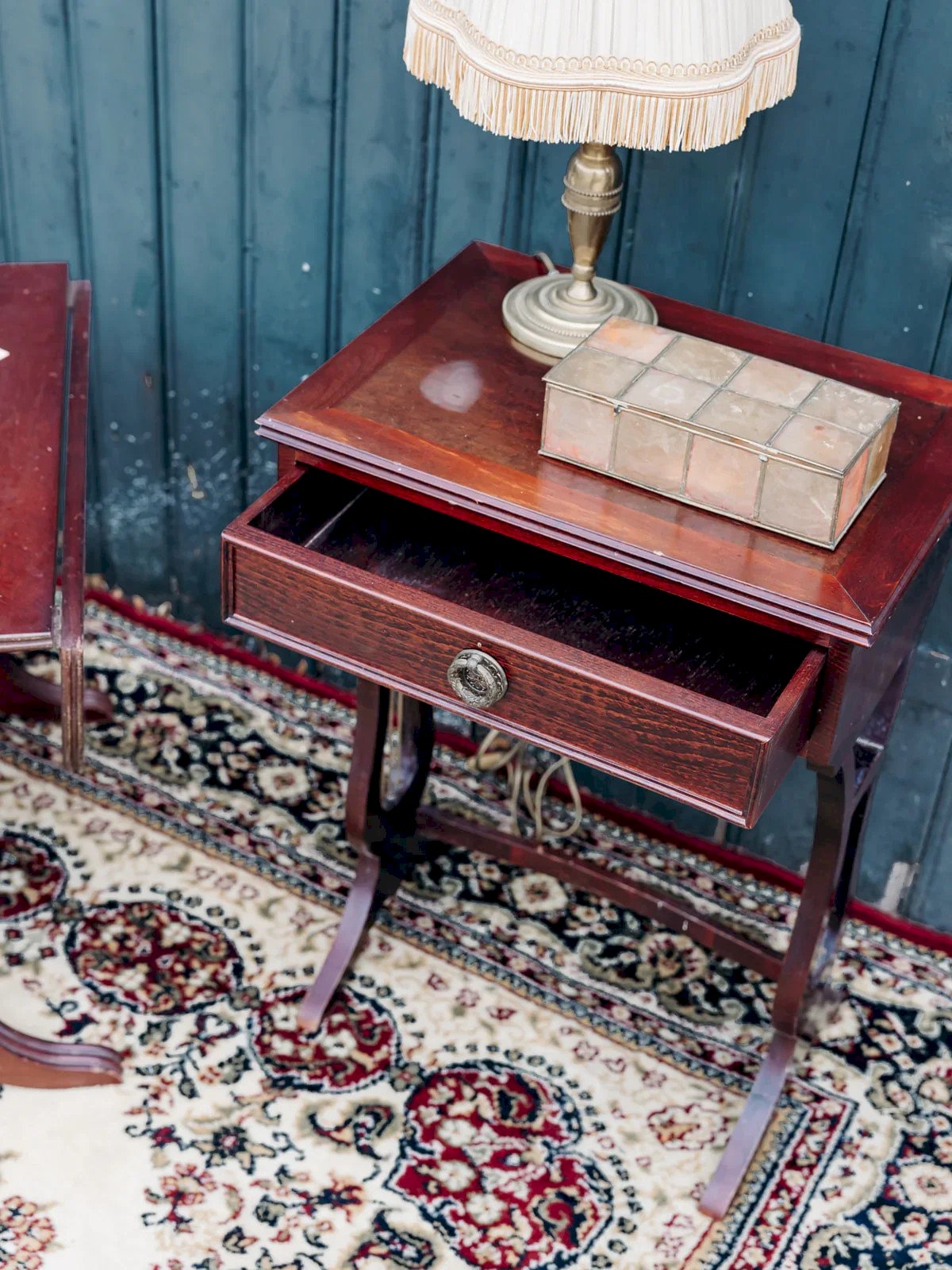 Add a touch of charm to your interior with this red-stained side or bedside table. Its golden brass details, such as its beautiful handle, lend it timeless elegance. A few marks on the top testify to its history and enhance its authenticity. A piece full of character, perfect for enhancing a corner of a bedroom or living room with style. Length: 43 cm Width: 31 cm Height: 60 cm Drawer height: 7 cm Condition: Used: Item has been utilized. Item shows some superficial signs of wear, fully operational and functioning correctly. It may be a display model or an item returned to the store after a short period of use, possible imperfections. Brand: Debongout Type: Vintage product Material: Wood Style: Country Custom: Bedside tables