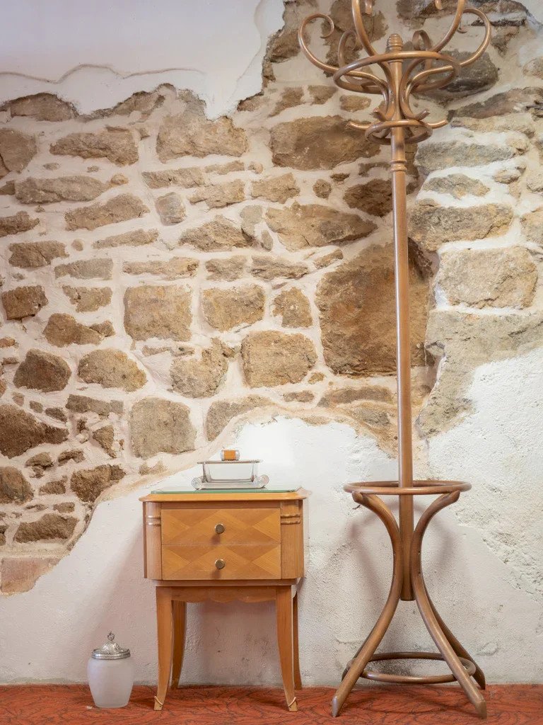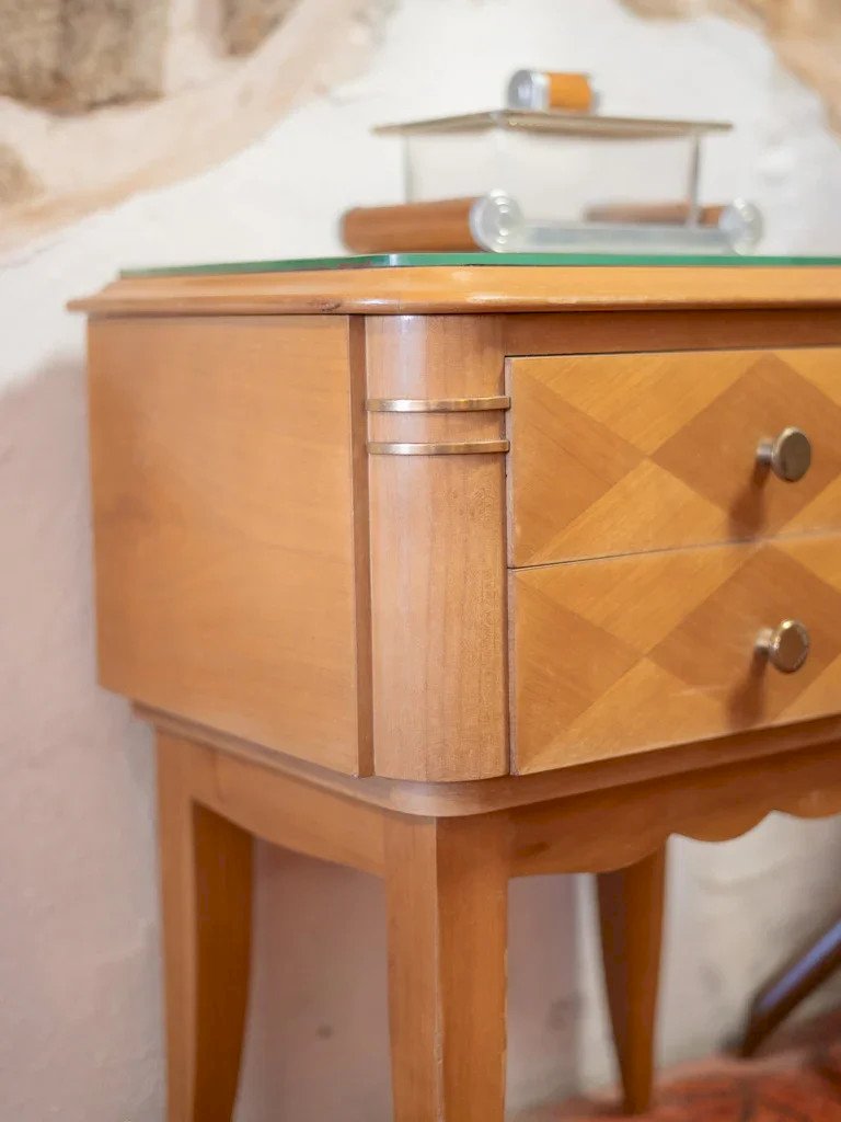 Discover this elegant 1940s bedside table, signed by the illustrious cabinetmaker Jean Pascaud. Made from precious wood with sycamore veneer and marquetry, it features two drawers adorned with round brass handles. Its Art Deco design is characterized by delicate moldings, brass inlays, and curved legs enhanced with brass shoes. The mirror tops show subtle signs of wear, attesting to its authenticity and timeless charm. A unique piece that will enhance your interior. Length: 49 cm Width: 33.5 cm Height: 60.5 cm Drawer height: 6.3 cm A brief history of the bedside table The term "bedside table" has referred since the Middle Ages to a small piece of furniture placed beside the bed. Originally designed to hold a lamp or personal items, the bedside table has evolved over time to include drawers and shelves. Essential in the bedroom, it now combines functionality and design, adapting to all interior styles. Condition: Used: Item has been used. Item shows some superficial signs of wear, fully operational and functioning properly. It may be a demonstration model or an item returned to the store after a short period of use. Any imperfections. Brand: Debongout Type: Vintage product Material: Wood, Brass Style: Country Customizable: Bedside tables