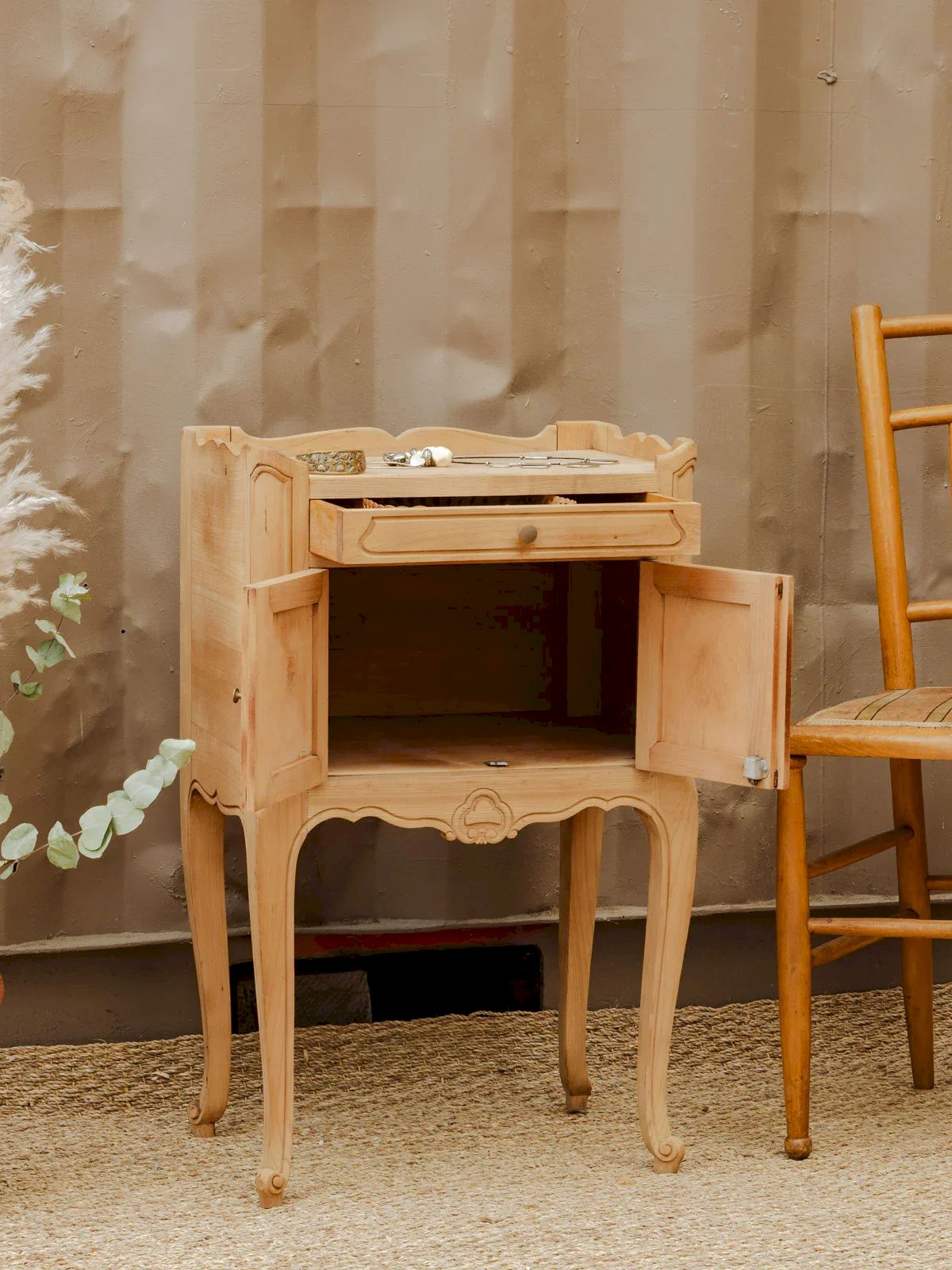Antique nightstand sanded to reveal its raw wood with a warm and natural grain. Compact and well-proportioned, it features a practical drawer and a niche closed by two small doors, perfect for keeping books and items within reach. The brass handles add a patinated touch that highlights its authentic character. Simplicity and softness for a bedroom with calming lines. Slight signs of time that contribute to its charm. Length: 45 cm Width: 30 cm Height: 73 cm Drawer height: 4 cm Niche height: 20 cm Brief history of the nightstand The term "nightstand" has referred since the Middle Ages to a small piece of furniture placed next to the bed. Originally designed as a support for a lamp or personal items, the nightstand has evolved over time to include drawers and shelves. Essential in the bedroom, it today combines functionality and design, adapting to all interior styles. Condition: Used item. Item showing some superficial signs of wear, fully operational and functioning correctly. It may be a demonstration model or an item returned to the store after a short period of use, including any imperfections. Brand: Debongout Type: Vintage product Material: Wood Style: Country Custom: Nightstands
