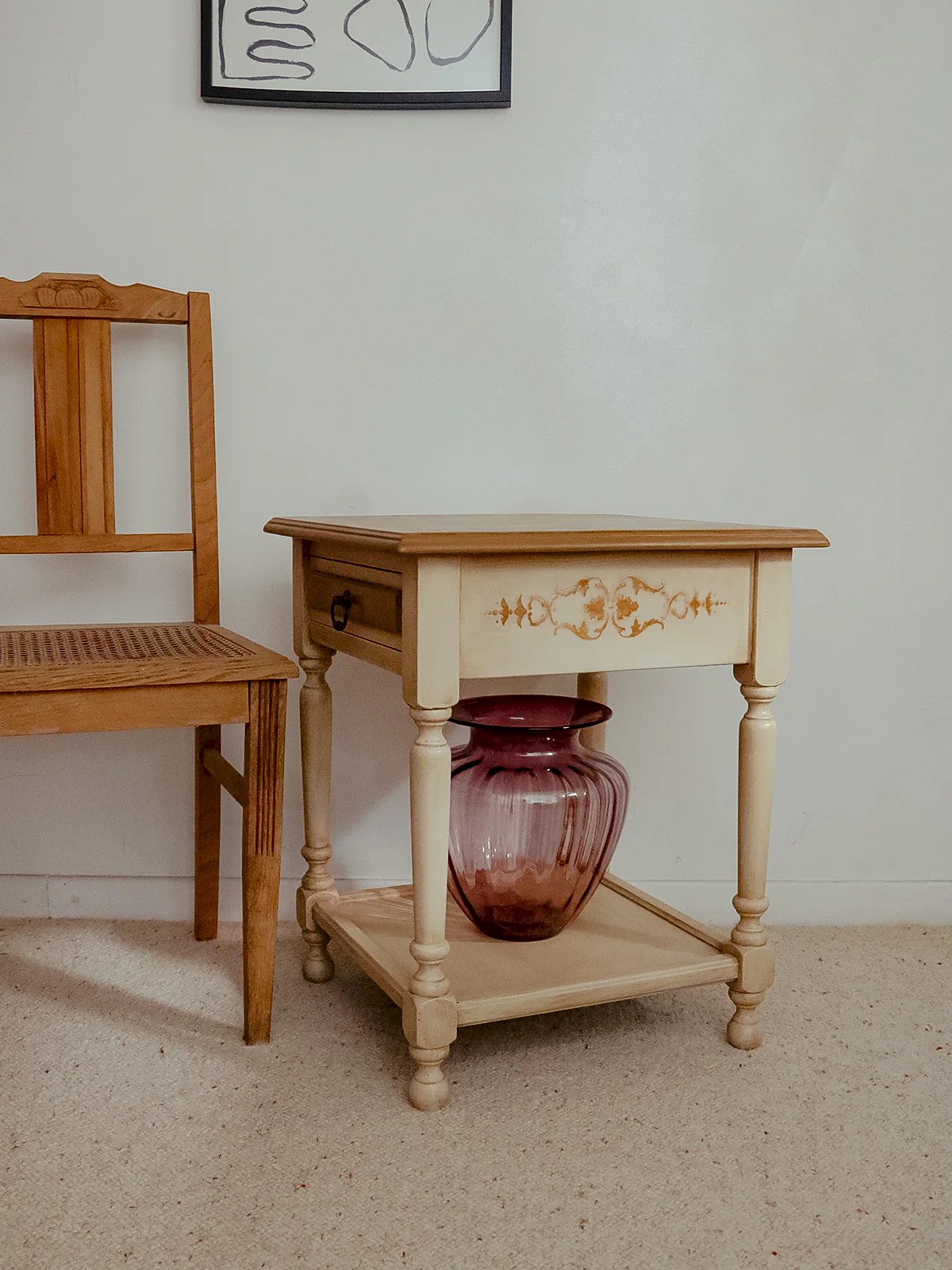 Add a vintage and warm touch with this cherry bedside table painted in mocha and beige tones, enhanced by a delicate golden stencil. Its slender silhouette and studied proportions provide a practical surface for a lamp and a few books, while the solid wood gives it strength and a beautiful presence. Ideal as a nightstand or side table in a living room or entryway, it creates a soft and sophisticated ambiance. Length: 50 cm Width: 50 cm Height: 60 cm A Brief History of the Bedside Table The term "bedside table" has referred since the Middle Ages to a small piece of furniture placed next to the bed. Initially designed as a support for a lamp or personal items, the bedside table has evolved over time to include drawers and shelves. Essential in the bedroom, it now combines functionality and design, adapting to all interior styles. Condition: Used: Item that has been used. Item showing some superficial signs of wear... Used: Item that has been used. Item showing some superficial signs of wear, fully operational and functioning correctly. It may be a demonstration model or an item returned to the store after a short period of use. possible imperfections. Brand: Debongout Type: Vintage Product Material: Cherry Style: Country Custom: Nightstands