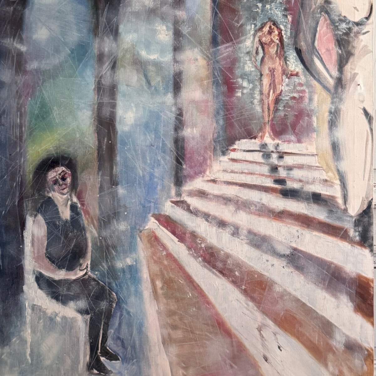 Oil on canvas by Véronique Maude Fini woman descending a staircase XXth A7751