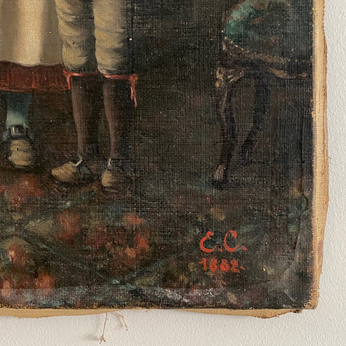 Oil on canvas interior scene with young children and parrot 19th century A5804 This oil on canvas represents a bourgeois interior scene. Two children, one of whom is wearing a headband, probably due to mumps, observe a parrot. The canvas is monogrammed EC 1882. The overall quality is excellent. Unfortunately, the artwork is presented unprepared and unrestored; we note tears and losses, signs of wear, and rubbing. Our photos allow you to appreciate the quality of the work. For the condition, please be sure to examine the photos closely. Don't hesitate to zoom in. The photos are an integral part of the description. Dimensions: Height: 37 cm Width: 28.5 cm Thickness: 2 cm A: G2BSOSG9KR P: 1648027 I remain at your disposal for any questions. Authenticity: Unknown Weight: Unknown Type: Oil Height: 37 cm Characteristics: On canvas Width: 28.5 cm Theme: Genre scene