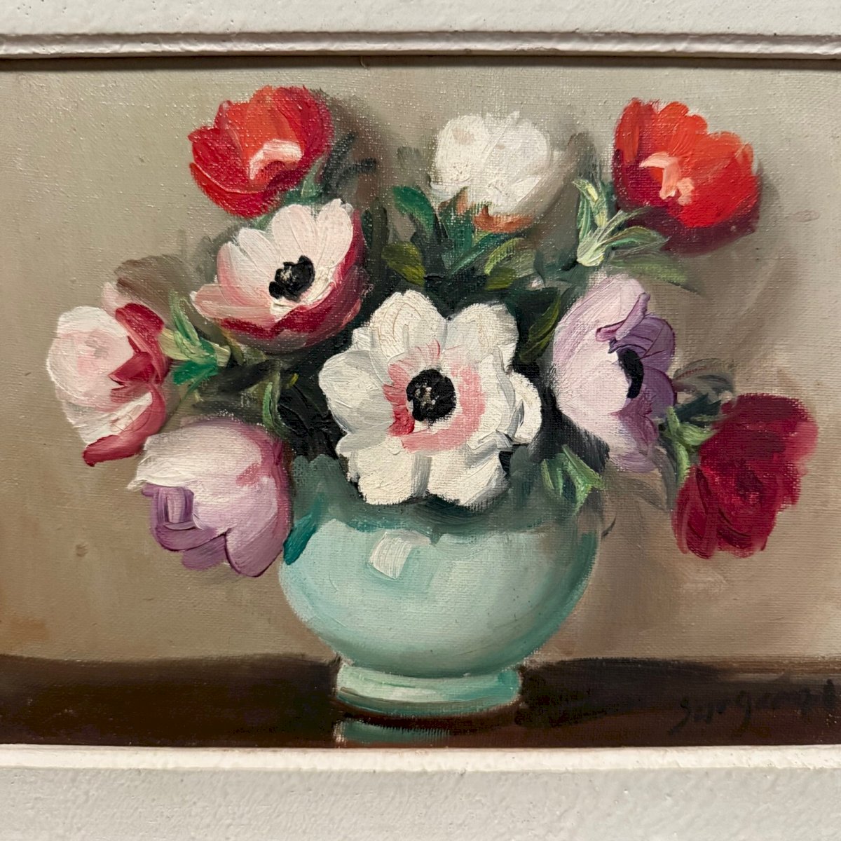 Oil on canvas still life flower bouquet 20th century L9032 We have not identified the artist of this mid-20th century oil on canvas, but the brushwork is interesting. The frame is cerused. Our photos allow you to appreciate the quality of the work. For the condition, please carefully examine the photos. Do not hesitate to zoom in. The photos are an integral part of the description. Dimensions: Frame Height: 30.5 cm Width: 35.5 cm Thickness: 6 cm View Height: 17.5 cm Width: 22.5 cm A: QX2CW2YLAY P: 1557389 I remain at your disposal for any questions. Type: Oil Height: 30.5 cm Features: On canvas Theme: Still life Width: 35.5 cm