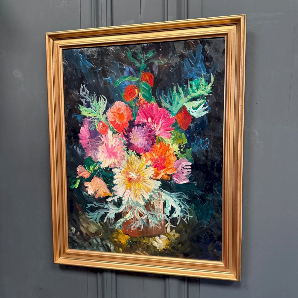 Oil on cardboard still life bouquet of flowers 1960 L9035 This still life is an oil on cardboard. Unsigned, it remains of good quality, decorative with a golden frame from the 60s-70s. The general condition is good. Our photos allow you to appreciate the quality of the artwork. For the condition, please refer to the detailed photos. Feel free to zoom in. The photos are an integral part of the description. Dimensions: Frame Height: 74.5 cm Width: 59 cm Thickness: 3 cm View Height: 63.5 cm Width: 48 cm S: EU9CBC34 I remain at your disposal for any questions. Type: Oil Height: 74.5 cm Features: Framed Theme: Still Life Width: 59 cm