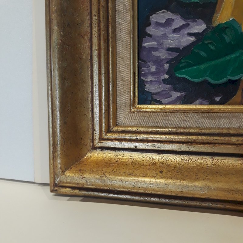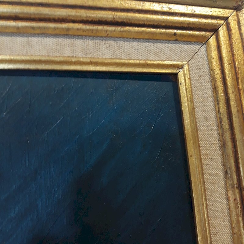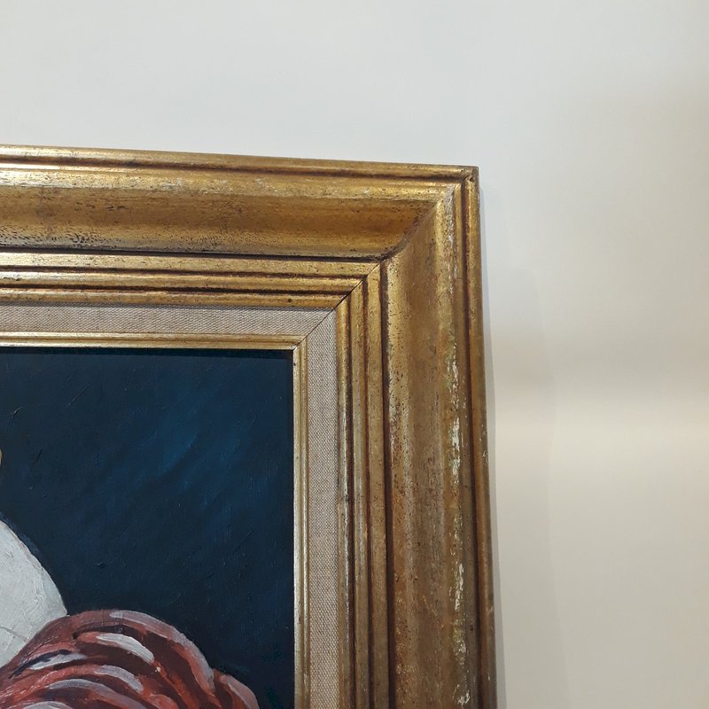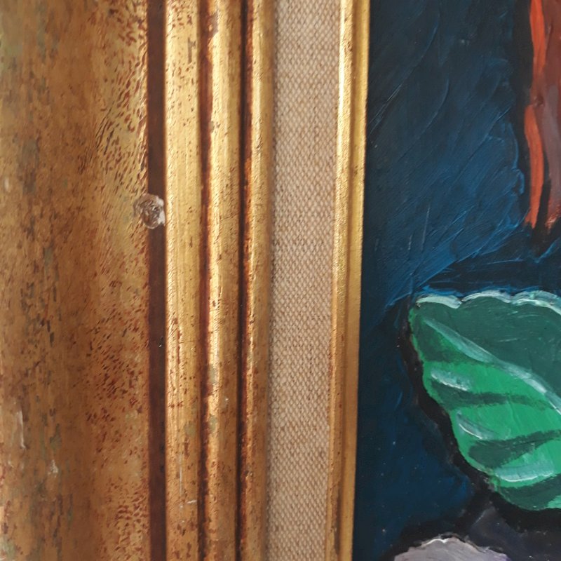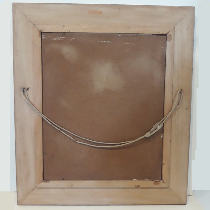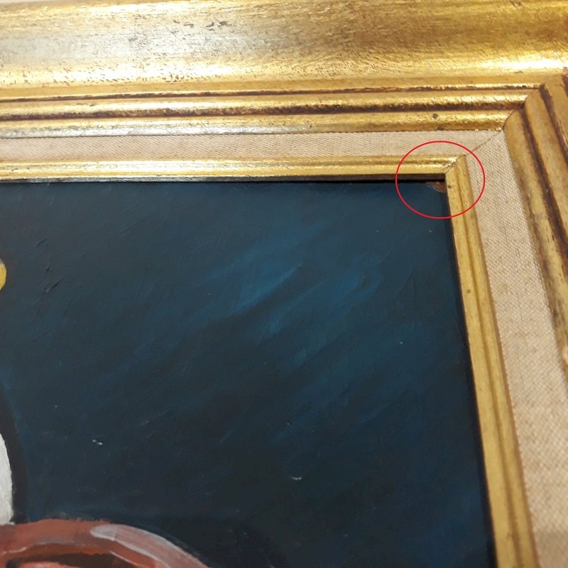Please note that the painting has tiny缺缺, the most "visible" being the one in the blue background at the top, outlined in red on one of our photos (it measures 2mm by 1mm) but it's really just being nitpicky!; the damaged corner at the top right is also outlined in red on a photo, about 3mm on each side, the frame has a dent in the vertical part on the left (photo taken).