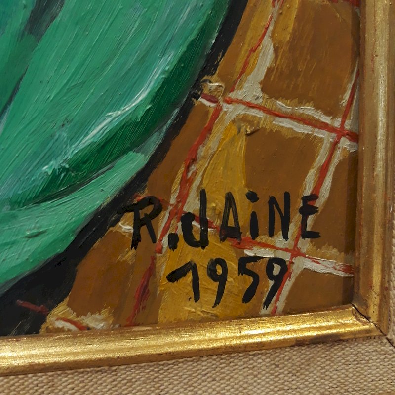 Oil on panel in its original aged gilded frame, jovial and very colorful clown, signed and dated bottom right R. JAINE 1959.