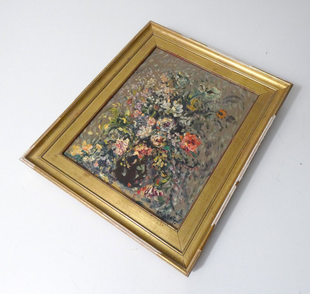 Painting, oil on canvas, multicolored bouquet. Signed Pierre MOBERG, lower right. Framed dimensions: 34.5 cm x 29.5 cm. The canvas is in very good condition, the frame, made of gilded wood, shows signs of use and superficial aging. Type: Oil Country of origin: France Style: 1940-1960 Genre: Art Deco Features: Framed Theme: Still Life Artist: Pierre Moberg