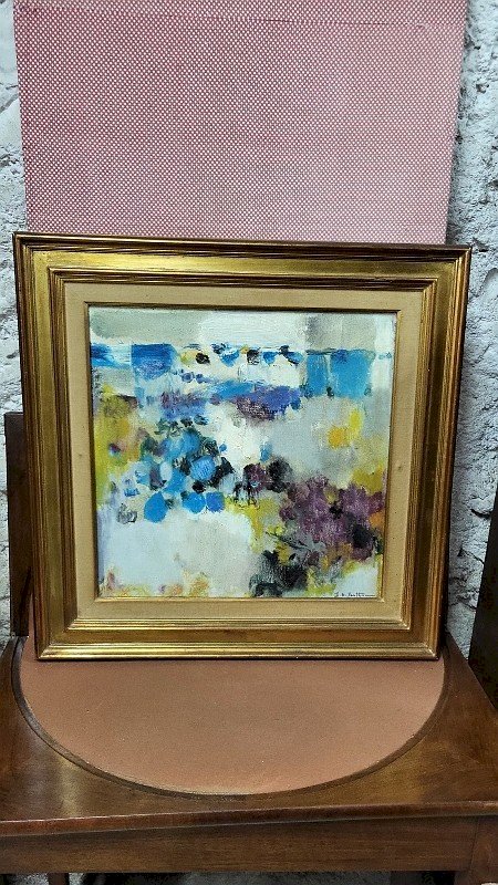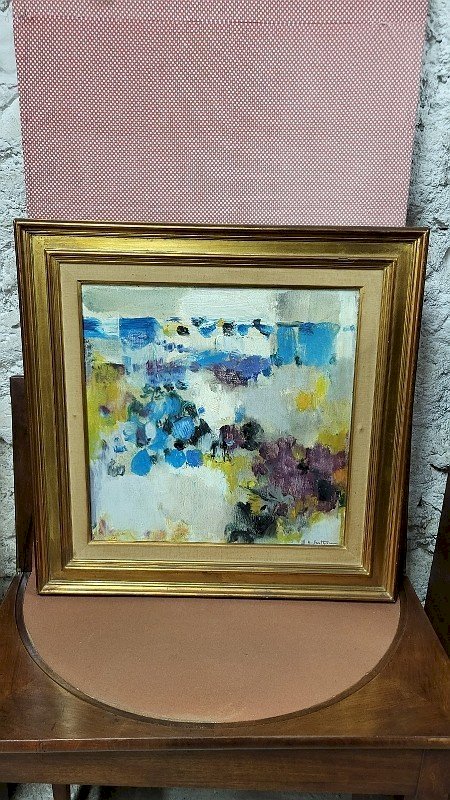 very beautiful painting oil on canvas signed by Maurice Elie Sarthou from 1961 it is in very good condition there is just a small chip on the frame and 2 marks on the mat at the sides because the screws at the back slightly protrude it is dated 1961 the frame measures 70 cm wide by 70 cm high the painting measures 51 cm high by 51 cm wide and 14.5 cm deep Type: Oil Features: Framed, Signed, On canvas Theme: Abstract
