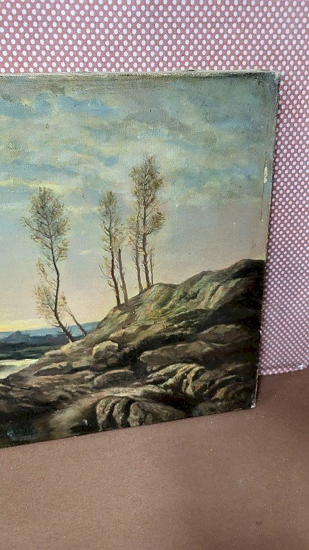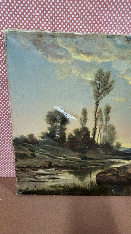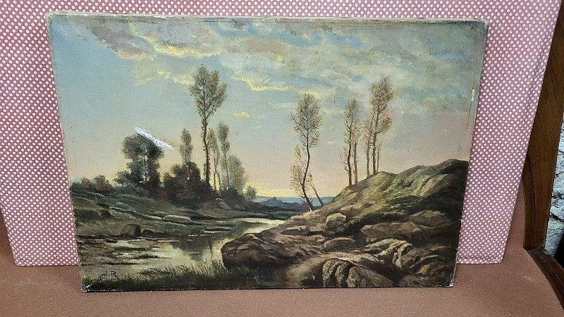 Beautiful painting on canvas signed "JR" depicting a river. It is in good condition; there is just a small tear and some restoration needed on the canvas. It measures 46 cm wide by 32.5 cm high. Type: Oil Theme: Landscape.