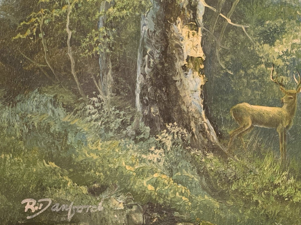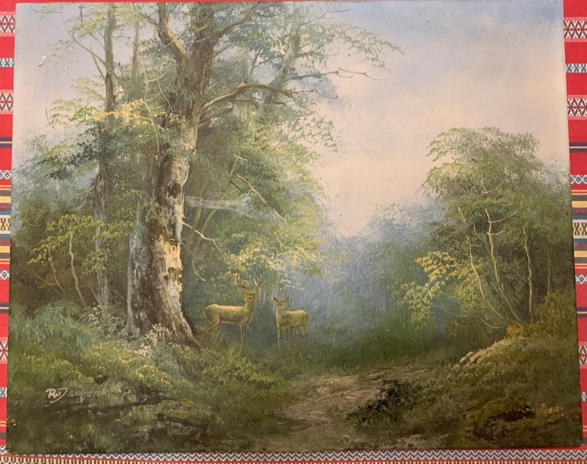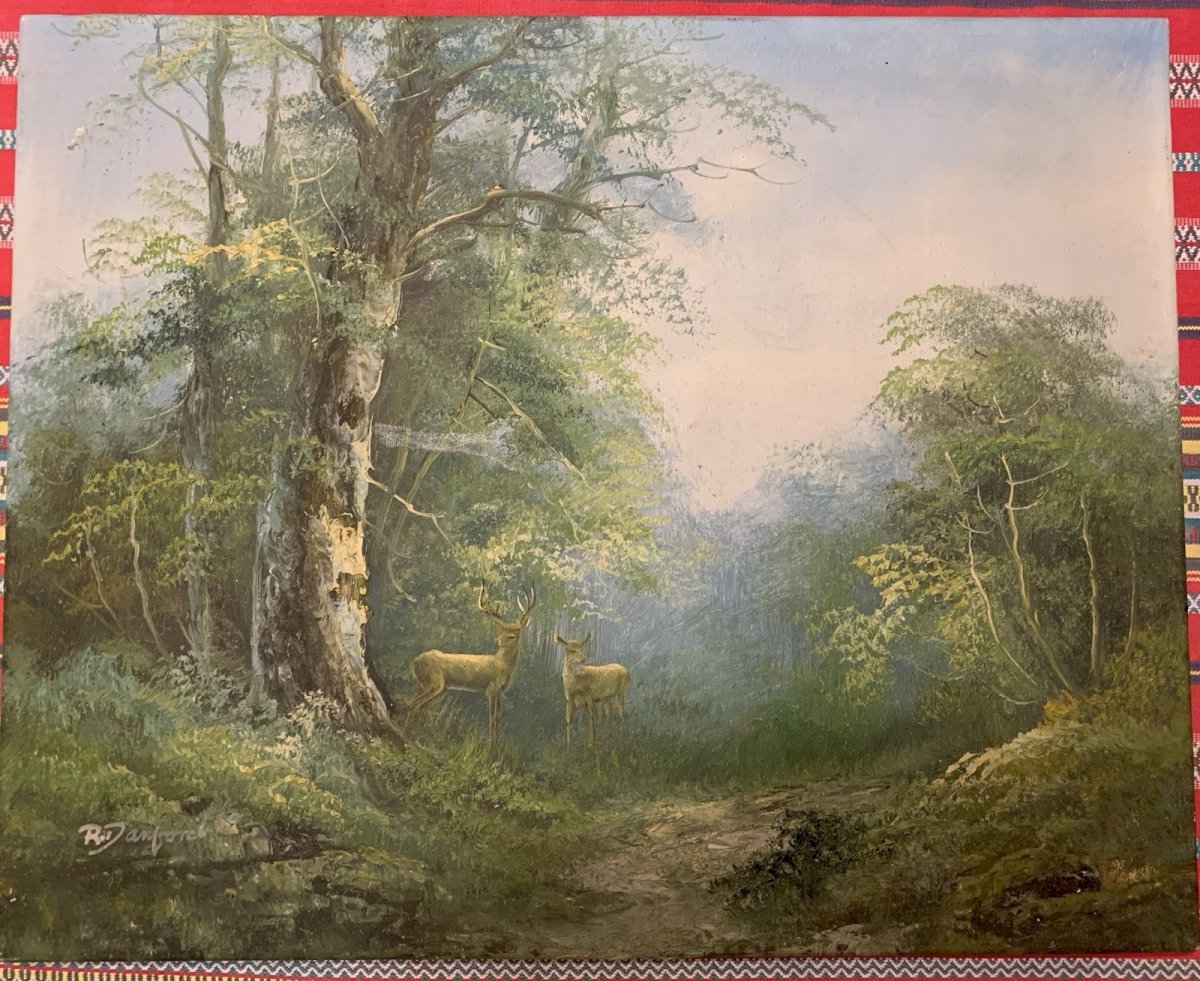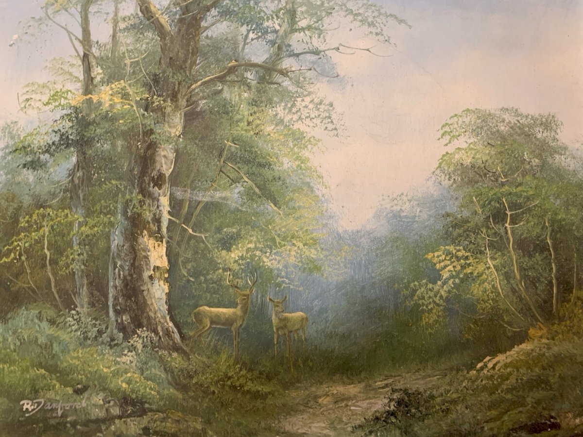 Beautiful knife oil painting Green and slightly misty landscape where a couple of deer are on the lookout Period: 1970s Signed R Danford Very good condition Some minor losses of material to note Size: 50x40.5 cm Type: Oil Country of origin: United States Style: 1970 Features: Signed Theme: Landscape Artist: R DANFORD