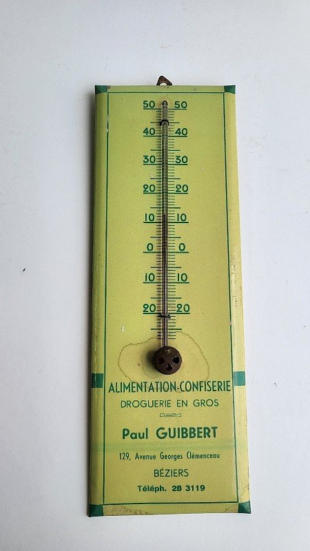 Pretty and old advertising thermometer for food, confectionery, and wholesale drugstore Paul Guibbert Béziers. It is in good condition with just a few signs of halos (see photo). The thermometer works and measures 28.3 cm in height, 9.8 cm in width, and 1.5 cm in thickness. Type: THERMOMETER Country of origin: Metropolitan France.