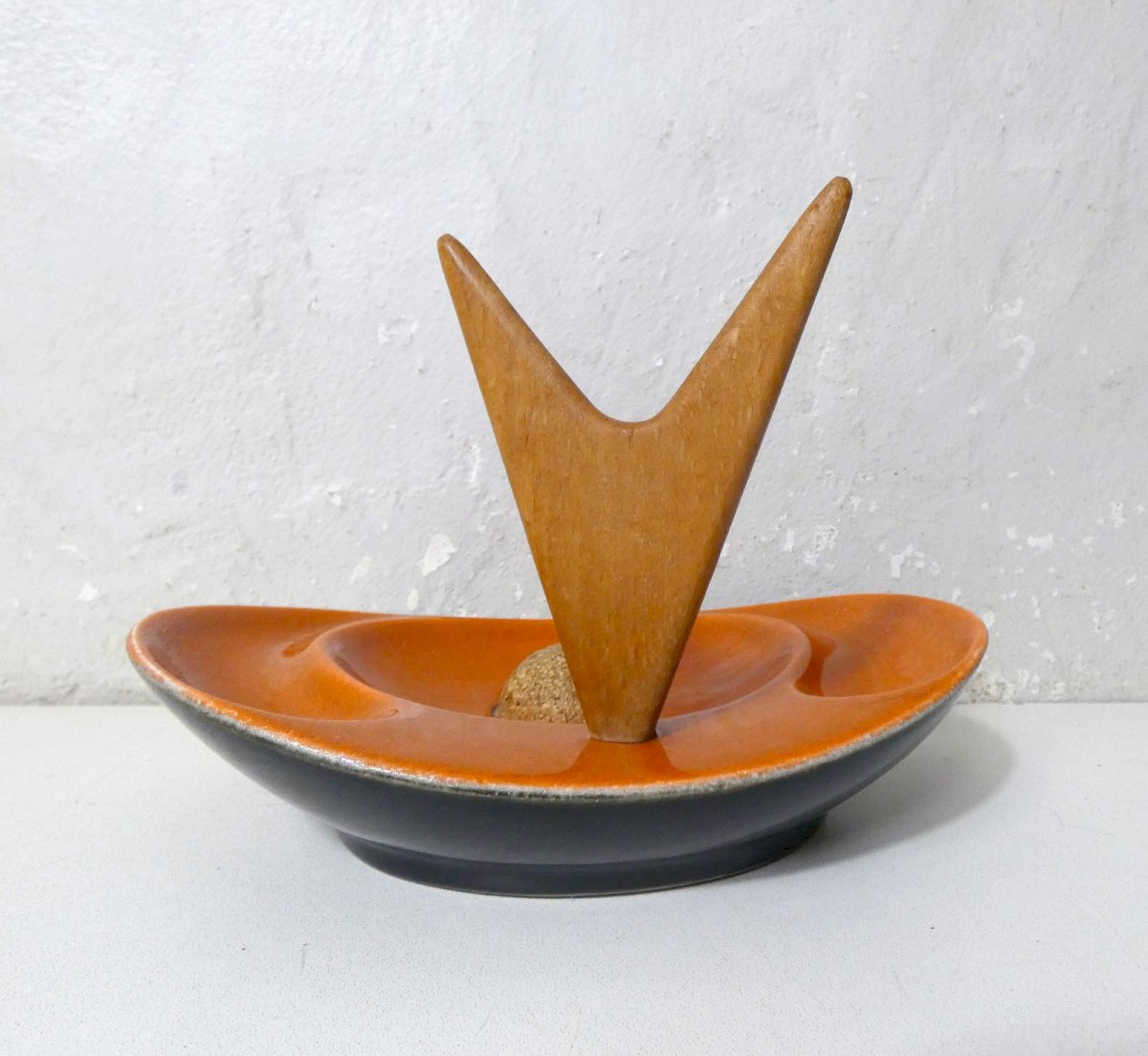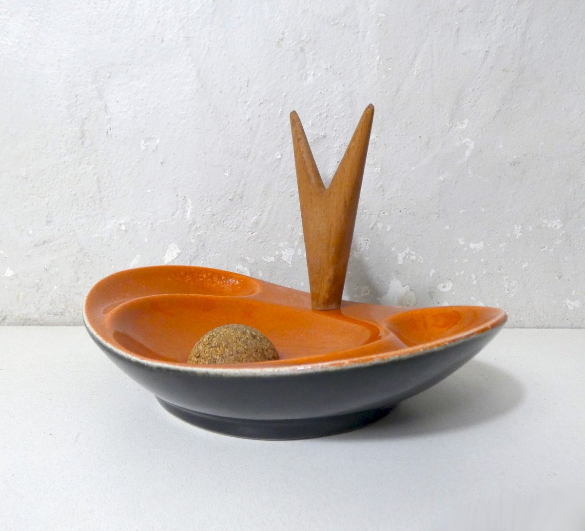 Old bowl / pipe stand. Made of orange and black earthenware and teak. Made in France. Height: 13 cm. Width: 18 cm. Depth: 13.5 cm. In excellent condition. Condition: Used: Item has been used. Item shows some superficial signs of wear... Used: Item has been used. Item shows some superficial signs of wear, fully operational and functioning correctly. It may be a demonstration model or an item returned to the store after a short period of use. Any imperfections. Type: butter dish. Material: Stoneware (ceramic).