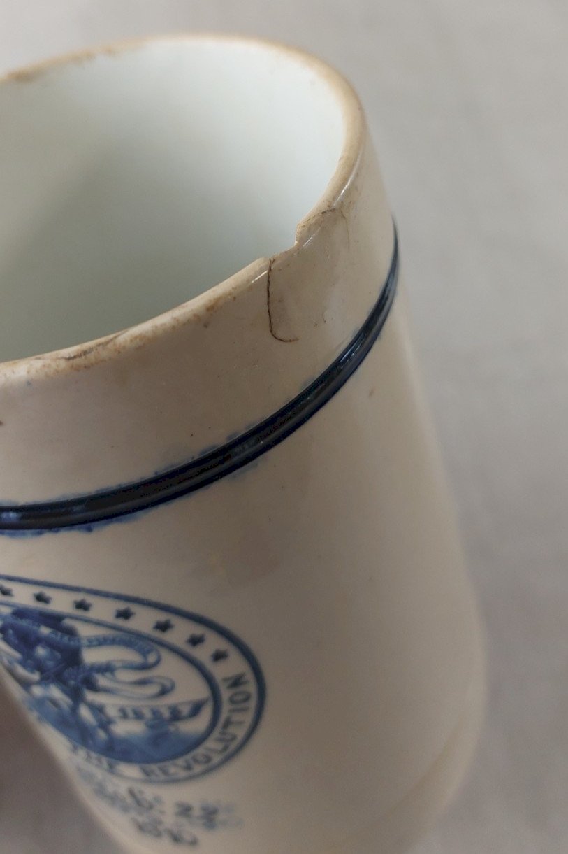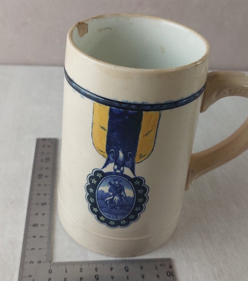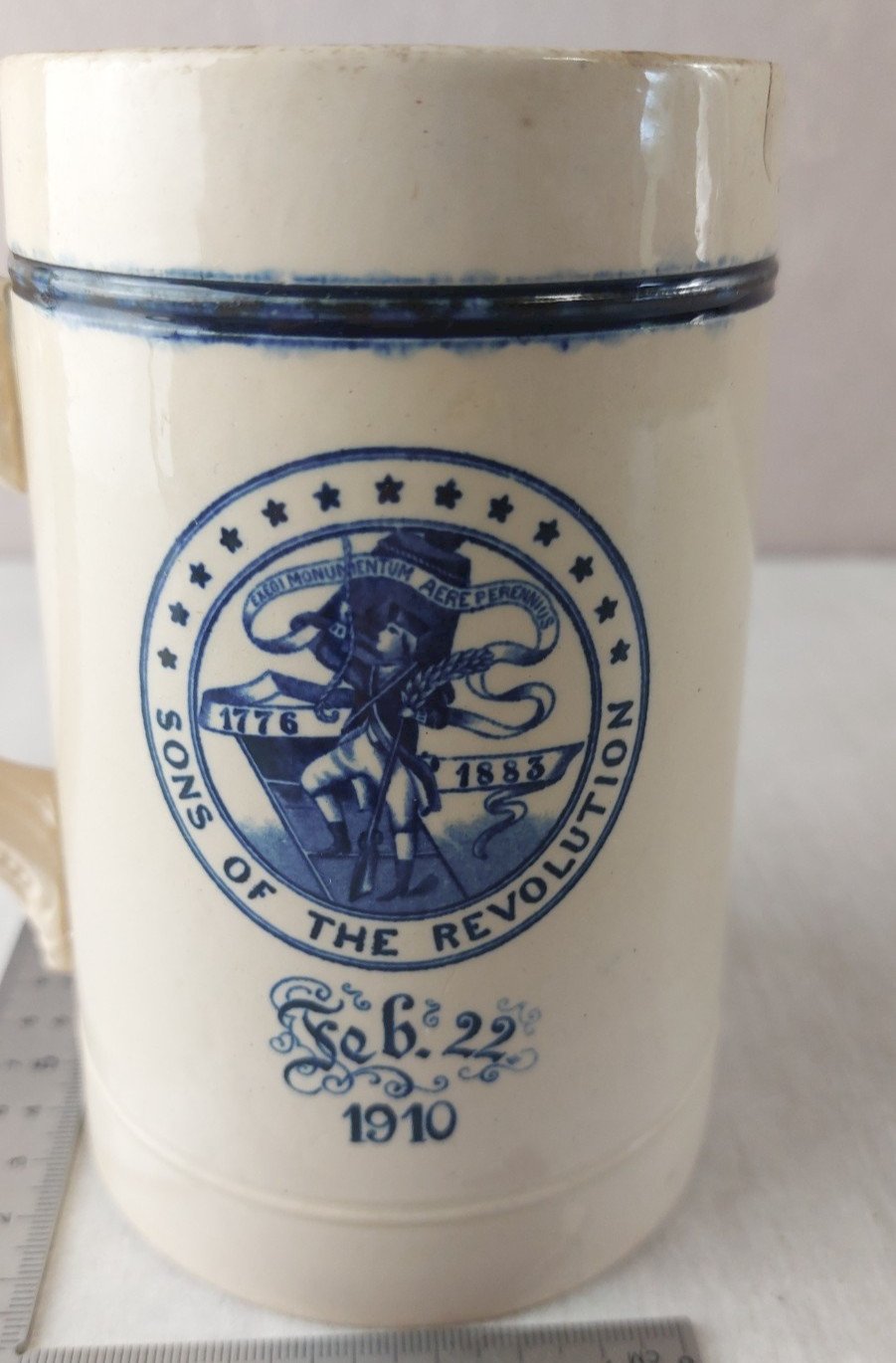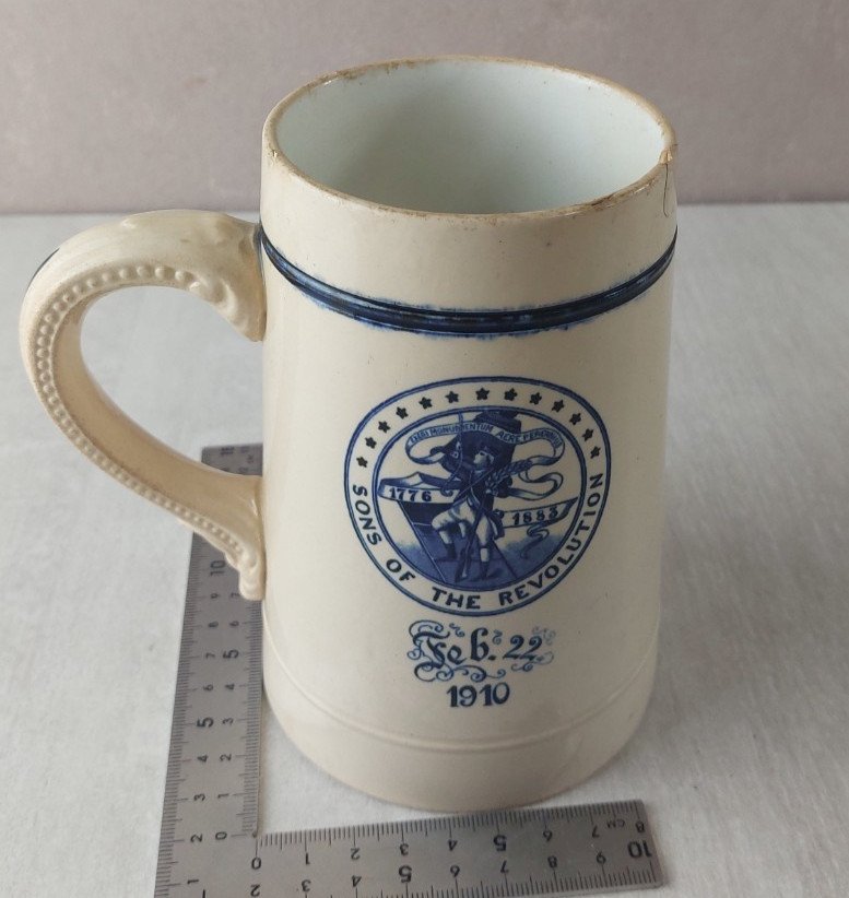 Old beer mug, ceramic, Sons of the revolution, Higgins & Seiter in fair condition, no cracks, several chips on the upper and lower edges marked Sons of the revolution, Feb. 22 1910 signed Higgins & Seiter New-York, Made in Germany 3287 diameter of the base 9.5 cm height 14 cm weight 660 gr see photos Check out my other items! Discount on shipping for combined purchases Condition: Used Item has been used. possible imperfections. Number of pieces: 1 Type: Mug