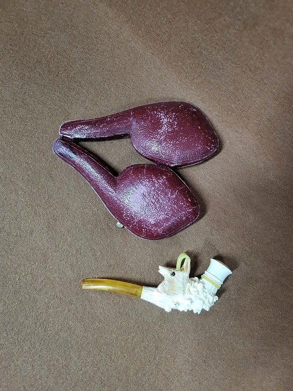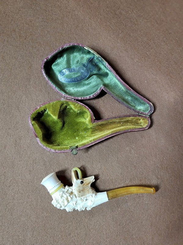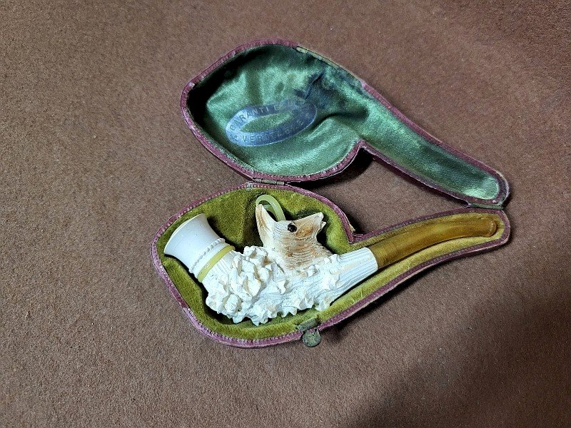 magnificent meerschaum pipe with ibex design, it is in good condition, there is just the mouthpiece that doesn't fit well on the pipe, there are no breaks, it has beautiful carvings, it comes with its box, it measures 10.5 cm long by 4.3 cm high and 1.5 cm thick, the box measures 12 cm long by 5.5 cm high and 3 cm thick. Condition: Used item. May show signs of wear. Type: PIPE Material: Meerschaum