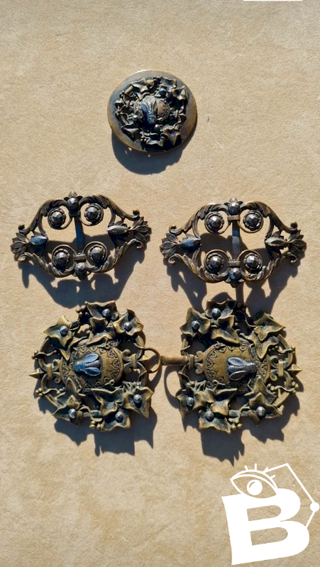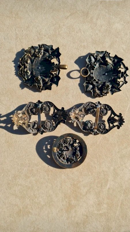 Above €25, please choose a carrier if possible. Take the opportunity to buy in bulk: - 5 items - 10% - 10 items - 20% - 20 items - 30%. Please look closely at the photos to see the imperfections. Condition: good, missing a stone on the cape buckle. Dimensions: cape height: 5 cm, width: 10 cm; shoe buckles height: 3.5 cm, length: 5.5 cm; button diameter: 3.5 cm. #cape buckle #gift #chic #collection #vintage #jewelry #vintagecapebuckle #vintage shoe buckles #vintage button #abeilleetlierre #belt buckleabeilleetlierre