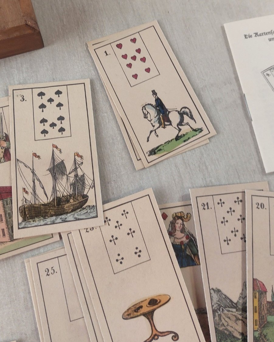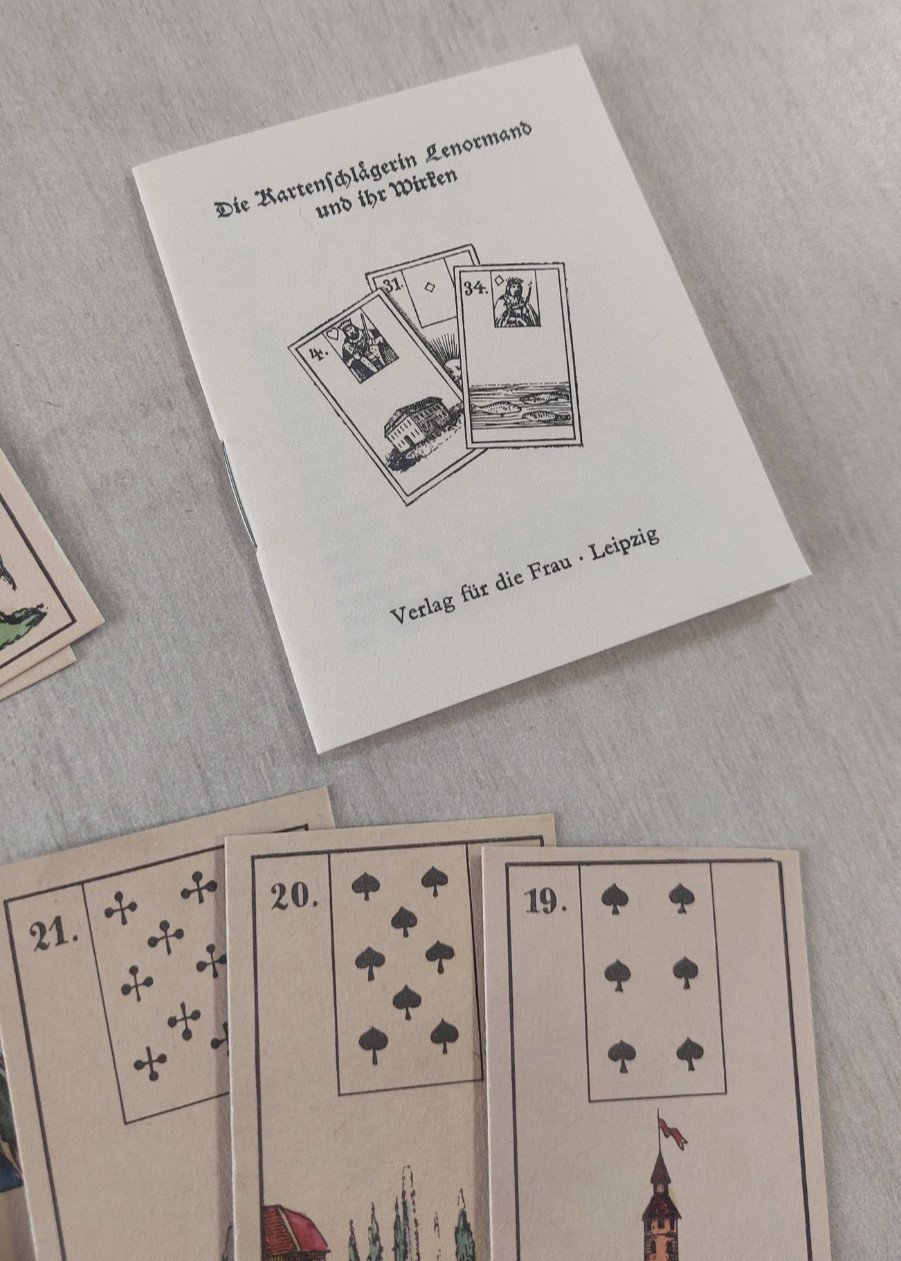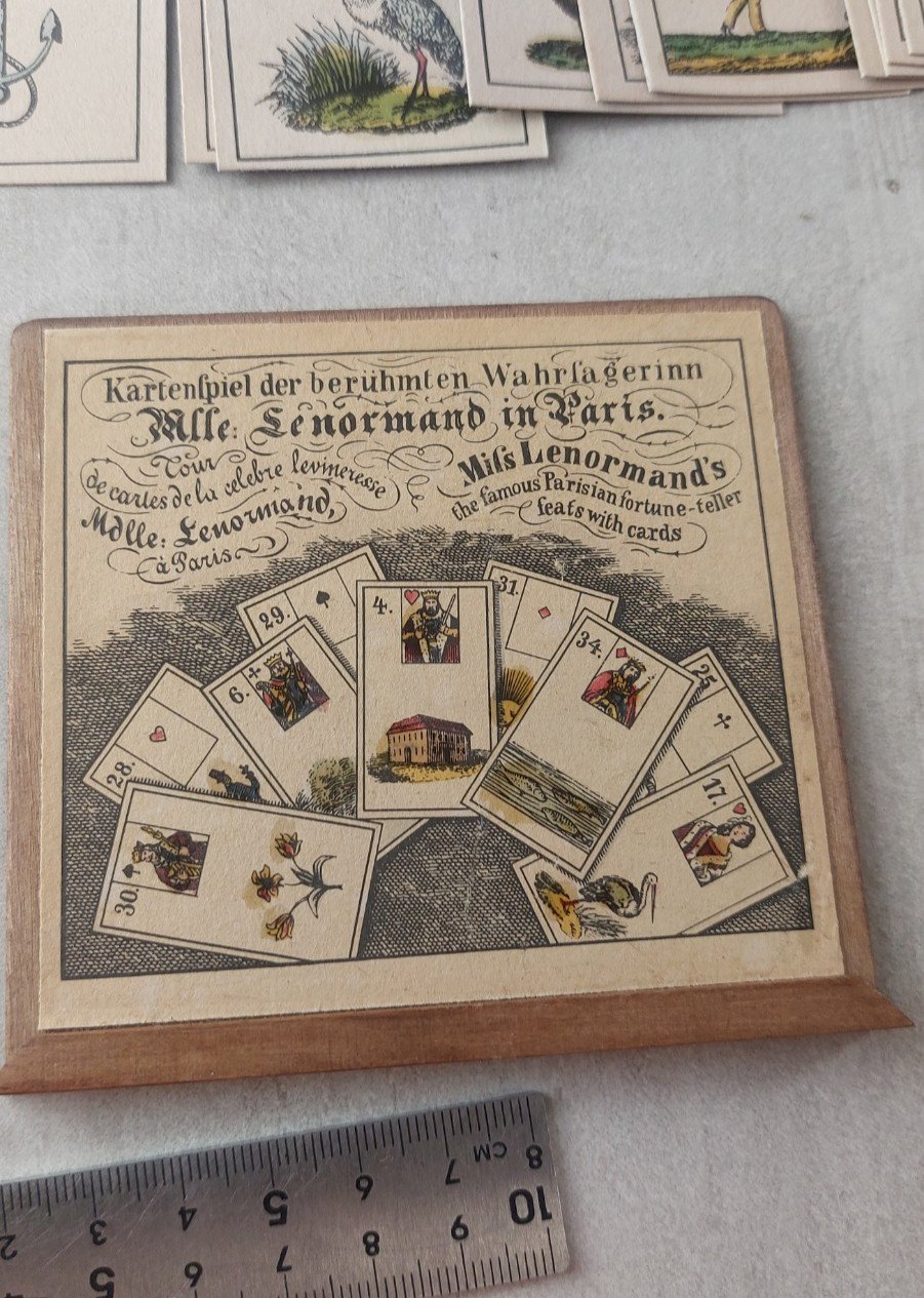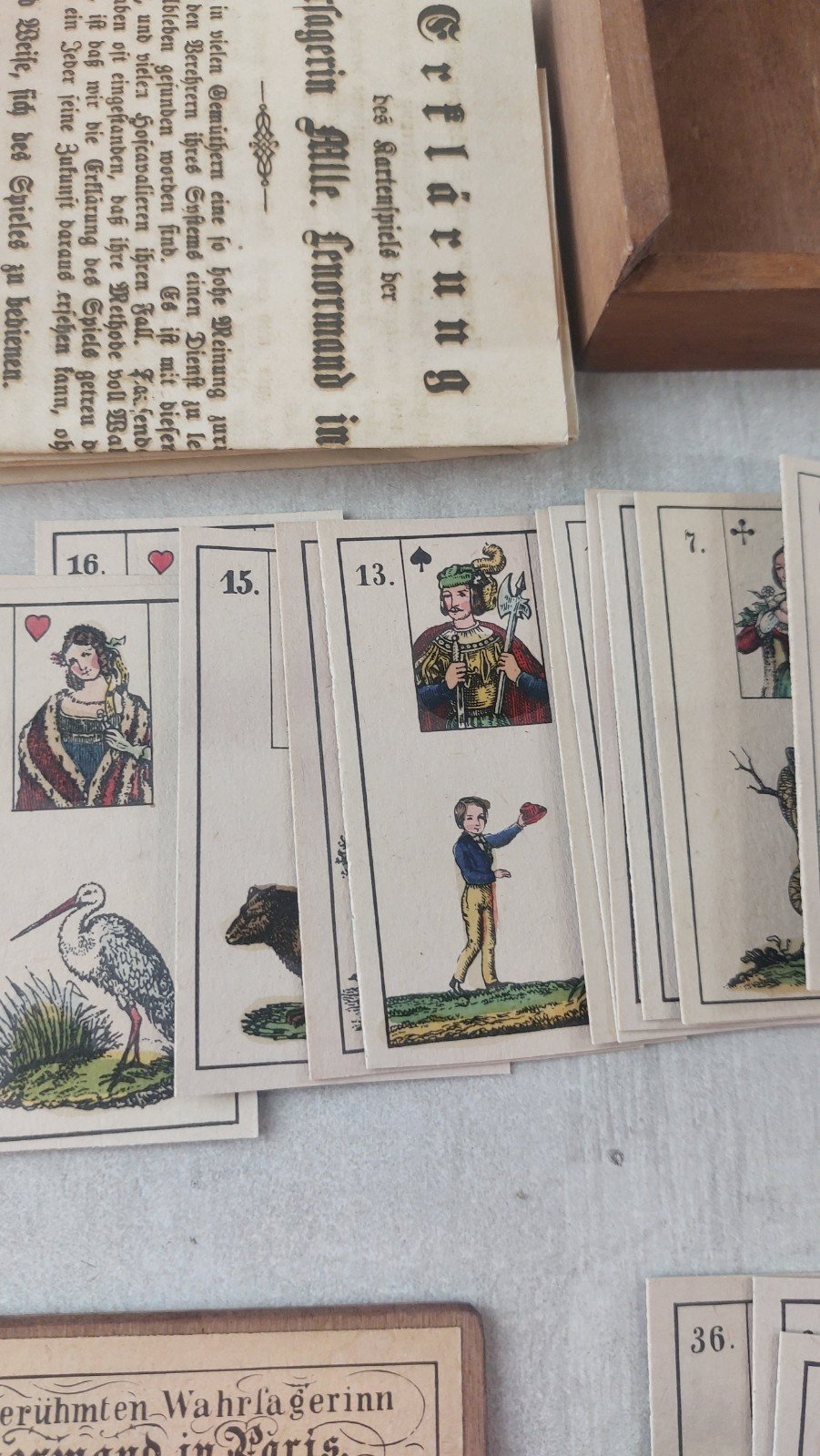 Antique card game / tarot, Miss Lenormand, Leipzig 1982 in good condition, some light wear with wooden box, cards numbered from 1 to 36, card dimensions 7.7 cm X 4.6 cm, see photos. Check out my other items! Reduced shipping costs for bulk purchases. Condition: Used. Item has been used. Possible imperfections. Subtype: Tarot cards Material: Paper, Cardboard.