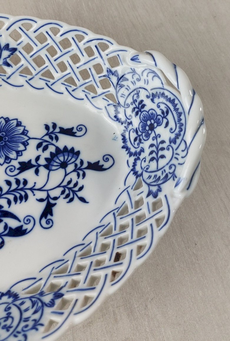 Old pocket tray / openwork basket, Blue Onion / onion flowers / Zwiebelmuster pattern, made of porcelain from Czechoslovakia / Czech, Meissen style in very good condition, no cracks or noticeable chips. Czechoslovakia dimensions 29 cm X 19.8 cm height 5 cm see photos. Check out my other items! Reduced shipping costs for combined purchases.