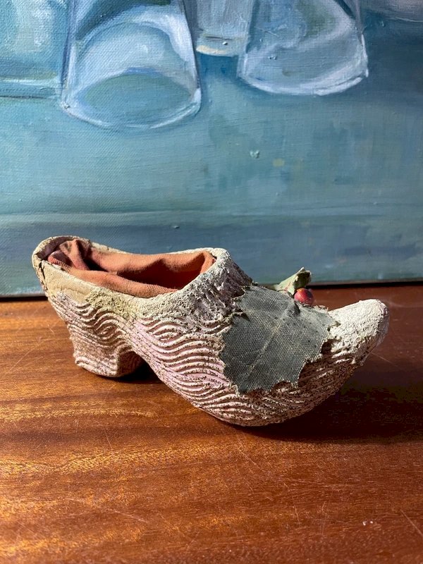 Old Art Deco shoe, oven blue clog, enameled with flowers