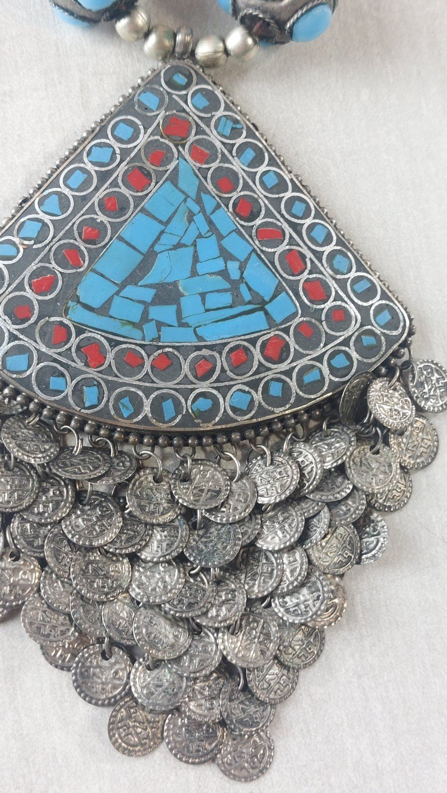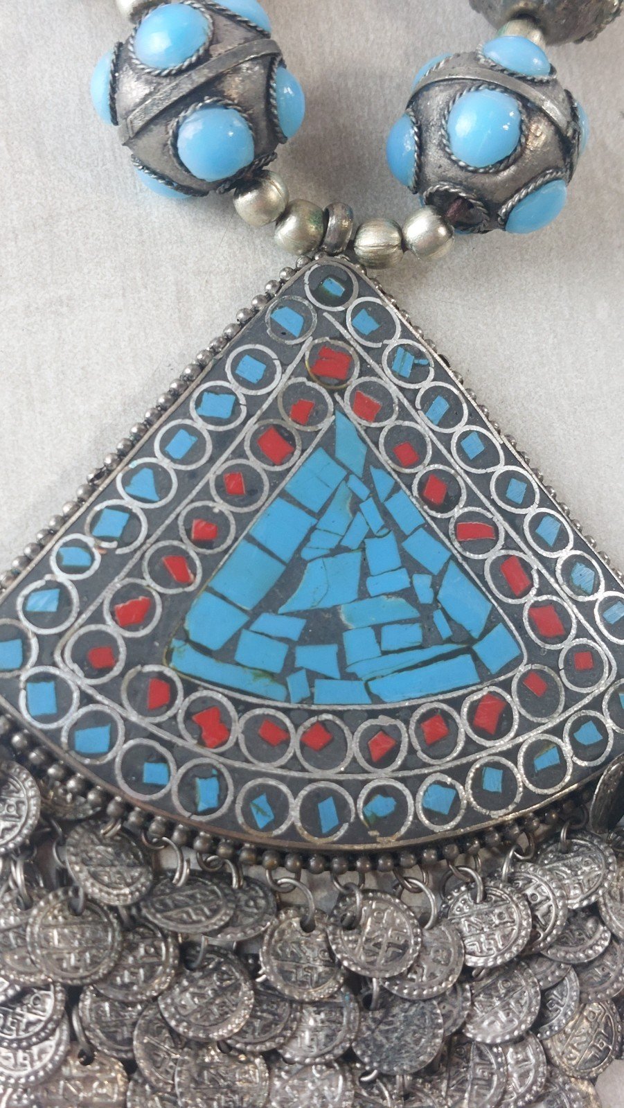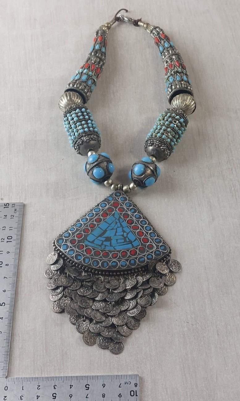 Old large ethnic necklace, turquoise and coral, in silver-plated metal or low-grade silver, in good condition, unmarked. Pendant dimensions: 12 cm x 8.2 cm, total necklace length: 44 cm, total weight: 137 g. See photos. Check out my other items! Reduced shipping costs for combined purchases. Condition: Used. Item has been worn. Any imperfections present. Dominant stone: Turquoise. Type: Necklace with pendant. Dominant color: Silver. Material: Coral.