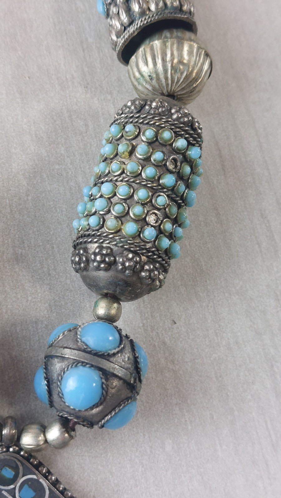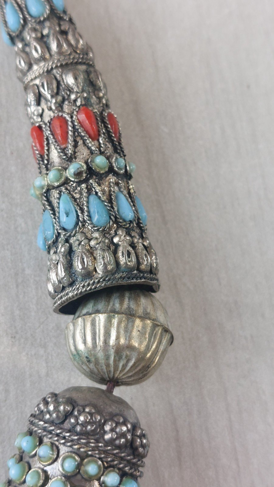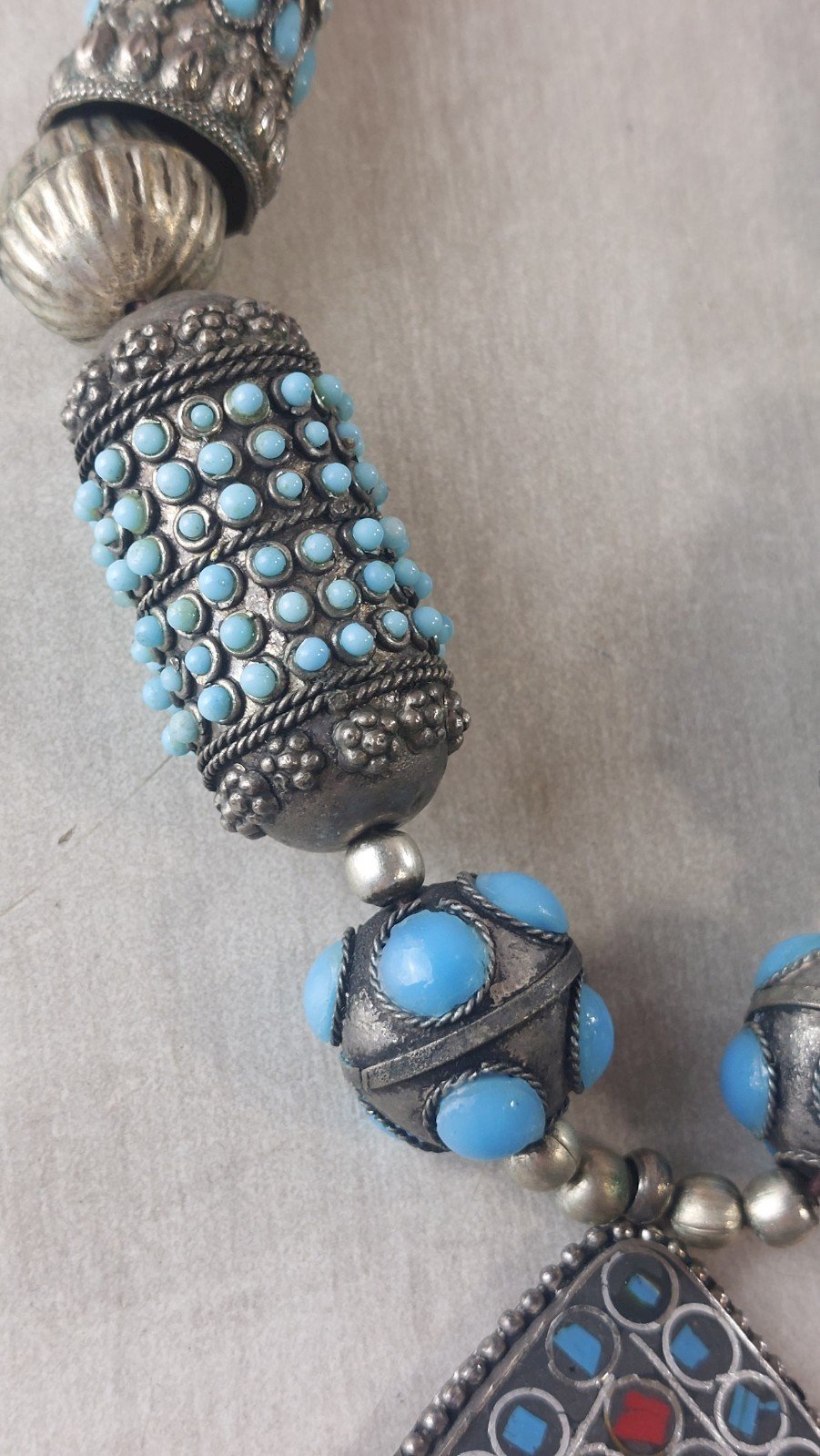 Old large ethnic necklace, turquoise and coral, in silver-plated metal or low-grade silver, in good condition, unmarked. Pendant dimensions: 12 cm x 8.2 cm, total necklace length: 44 cm, total weight: 137 g. See photos. Check out my other items! Reduced shipping costs for combined purchases. Condition: Used. Item has been worn. Any imperfections present. Dominant stone: Turquoise. Type: Necklace with pendant. Dominant color: Silver. Material: Coral.
