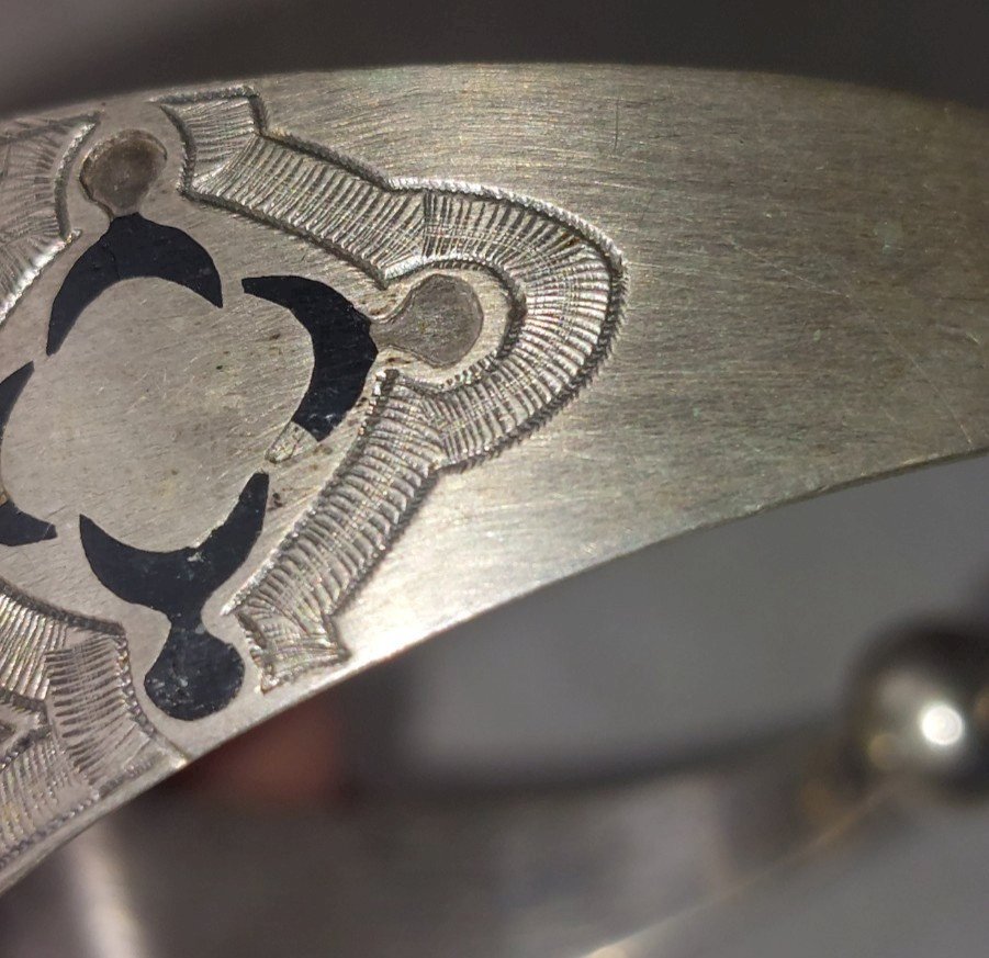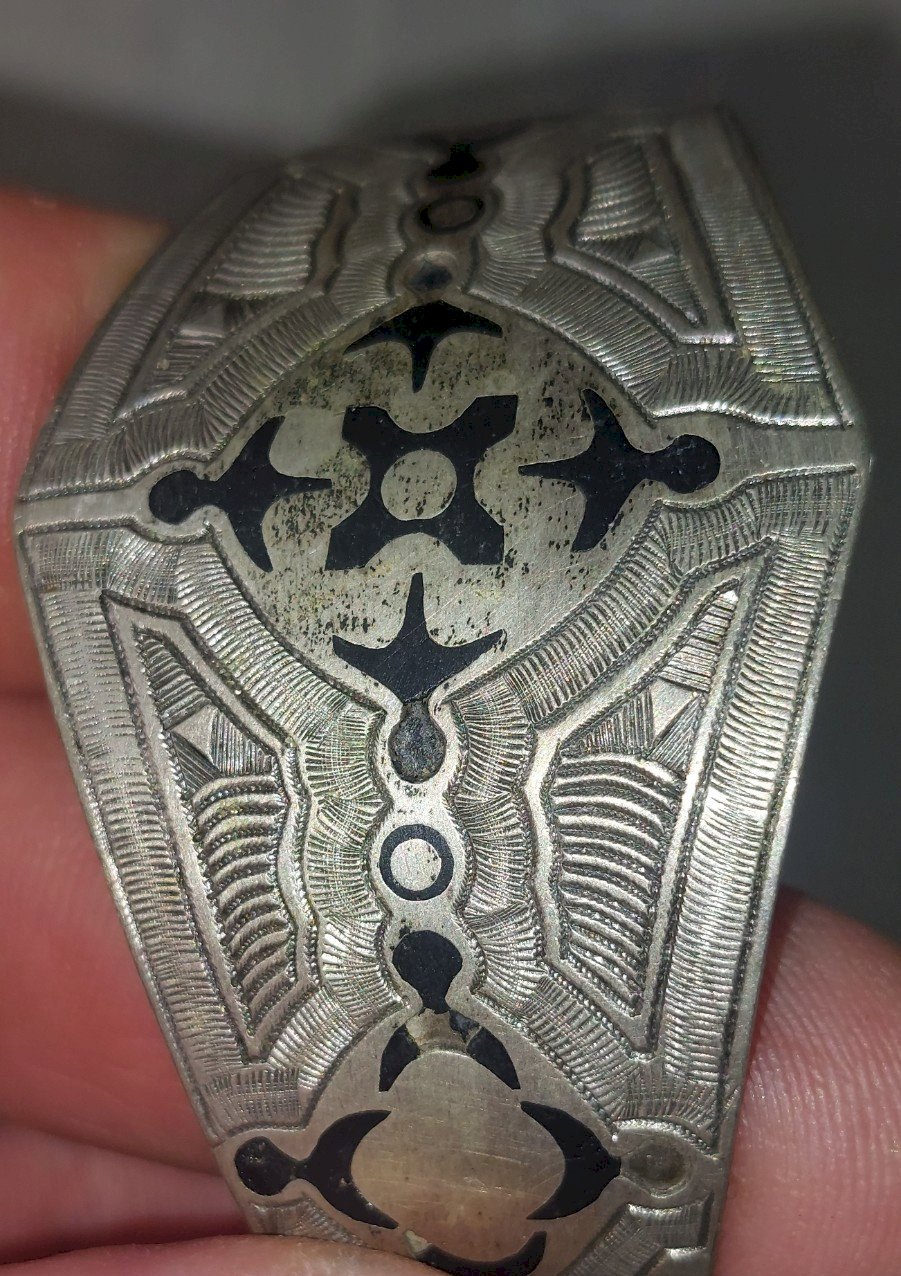 Old cuff bracelet, ethnic / Tuareg, in silver ?? in good condition, some wear in the unmarked decorations, no hallmark width of decoration 3.3 cm weight 33.17 gr see photos Consult my other items! reduced shipping costs for combined purchases Condition: Used Item has been worn. any imperfections.