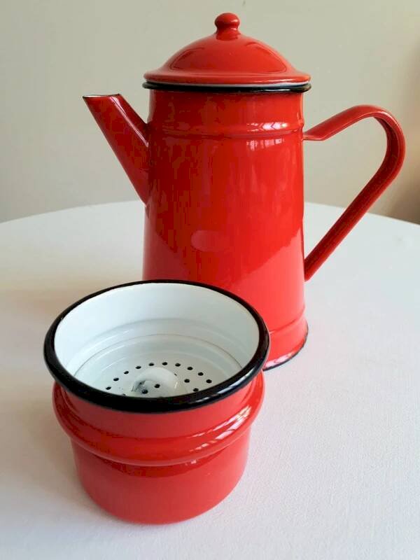 Antique enamel coffee pot with filter. Ideal for decoration or kitchen use.