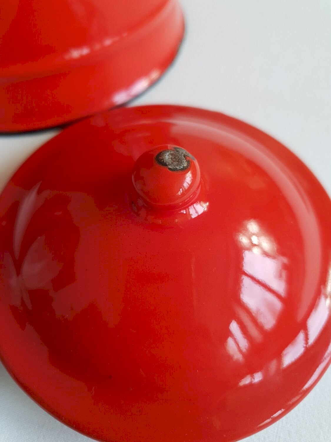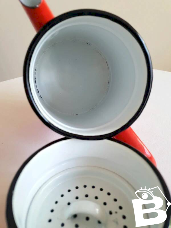 Authentic vintage style. Enamelled sheet metal, red color with black trim. Good general condition (some signs of use). Height: 26cm. L: 13 W: 13 H: 27.