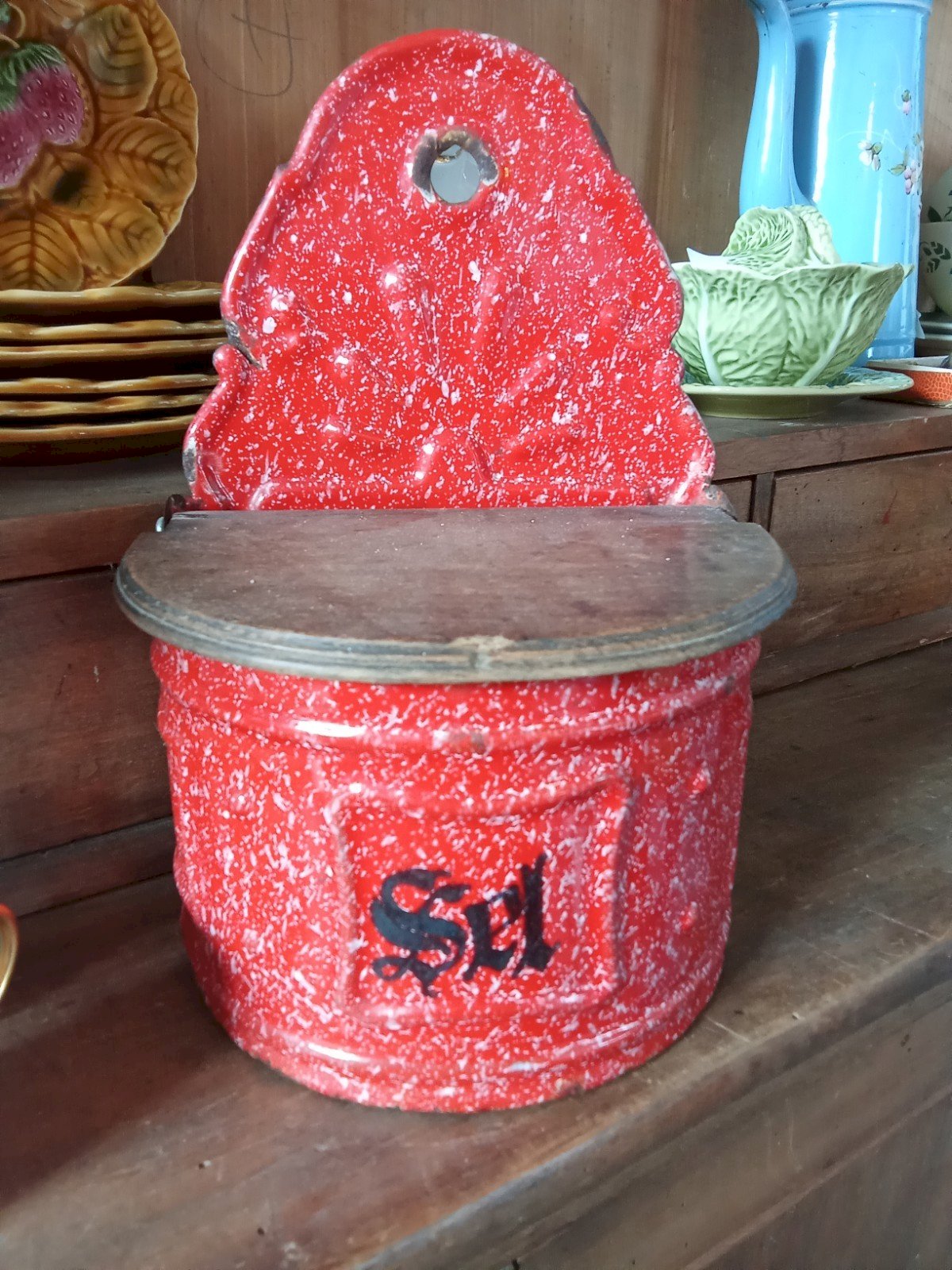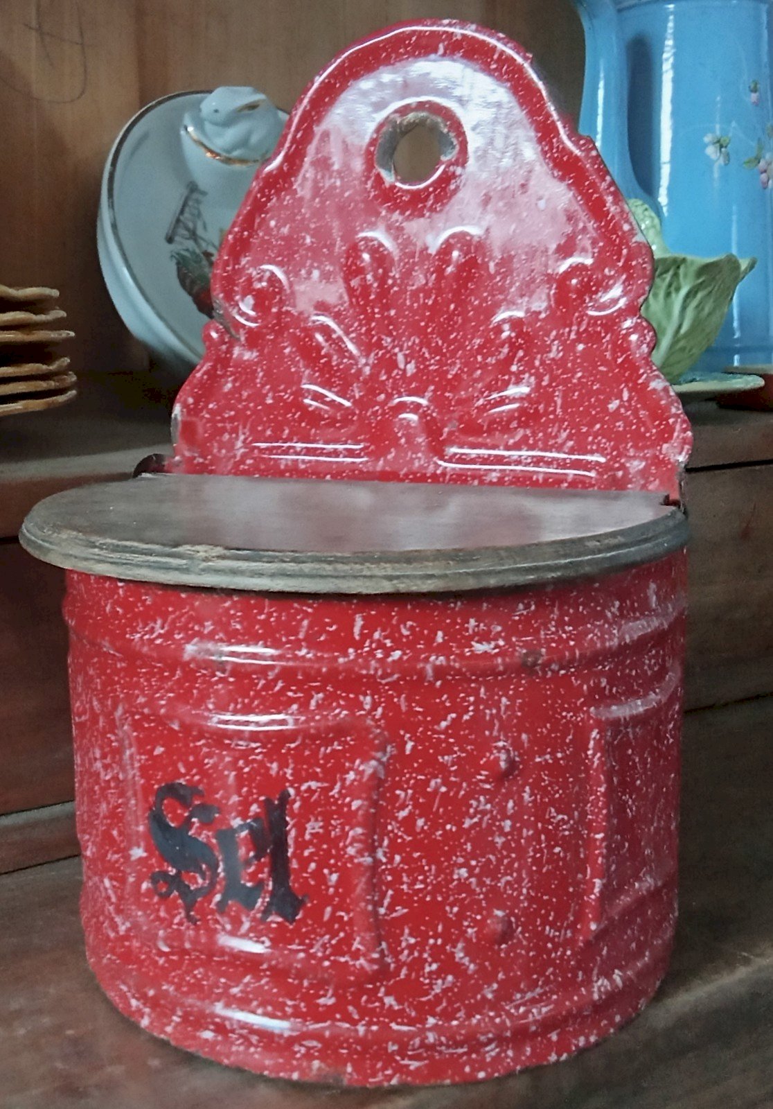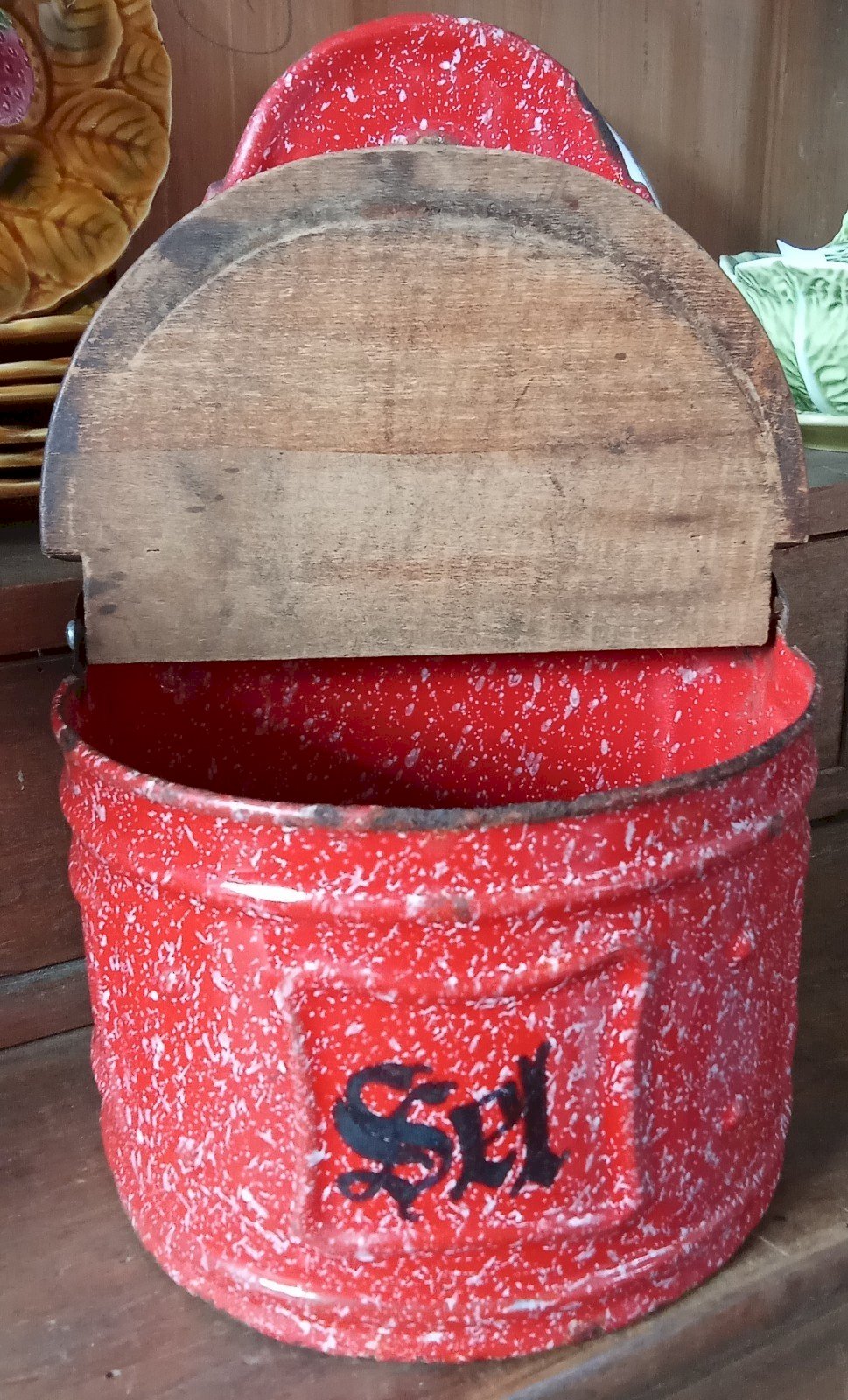 Old Enamelled Red and White Tin Salt Box with Wooden Lid in Good Condition Vintage Antique Kitchen. Height 24.6 cm Depth 11 cm Width 16 cm Condition: Used: Item that has been used. Please check the seller's description for more details ... Used: Item that has been used. any imperfections. Color: White Type: Box Country of origin: Metropolitan France
