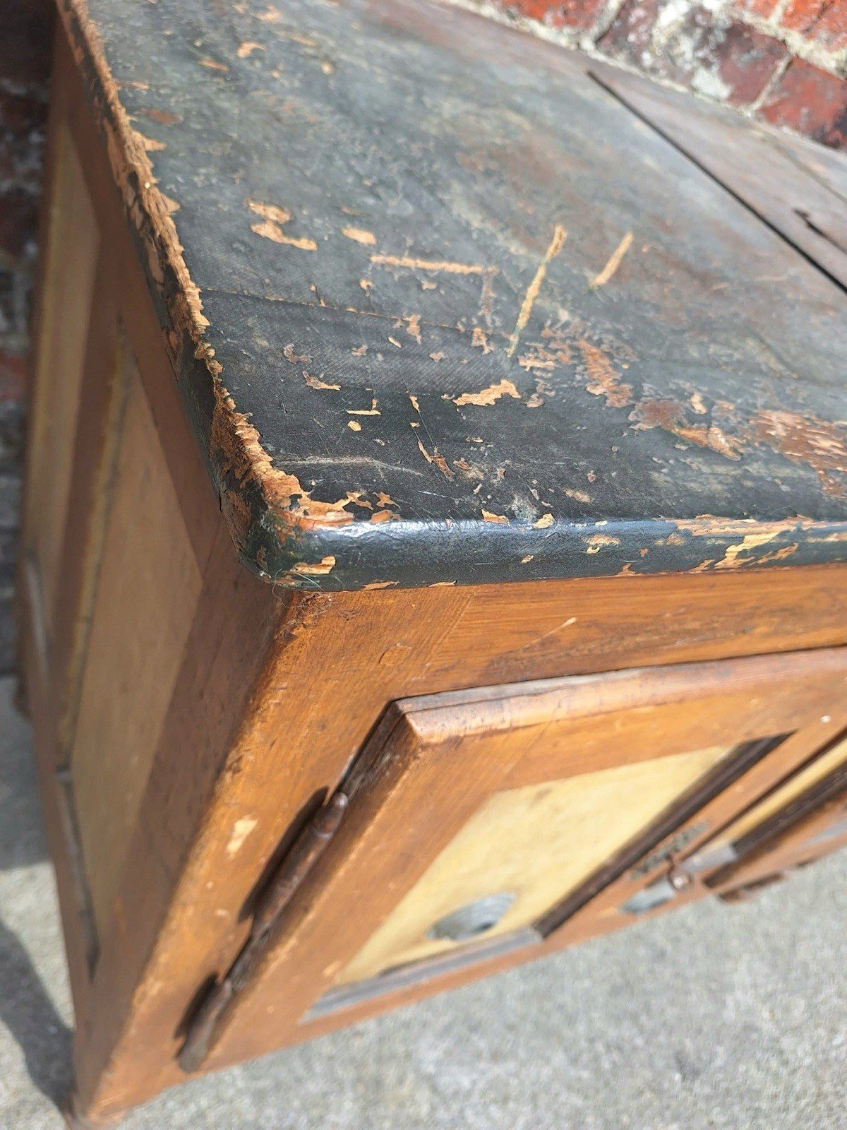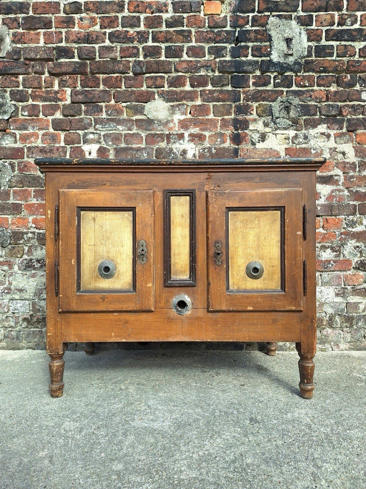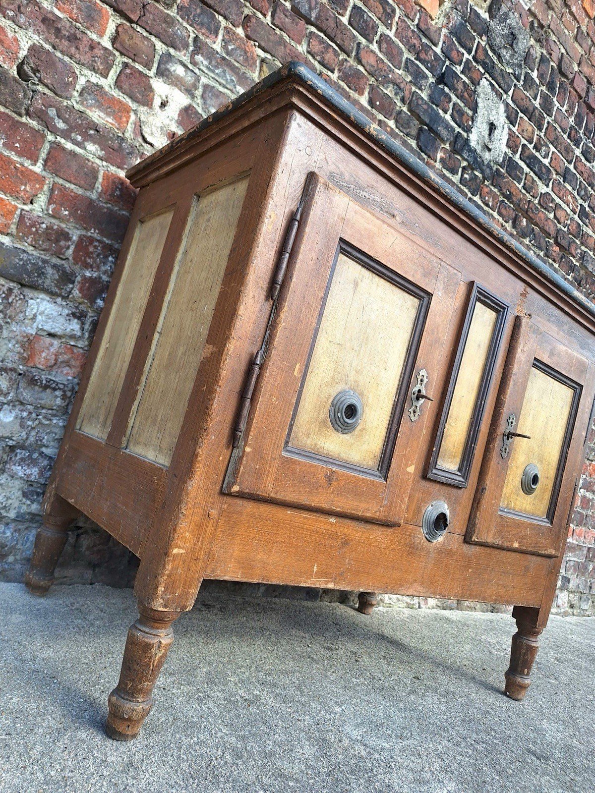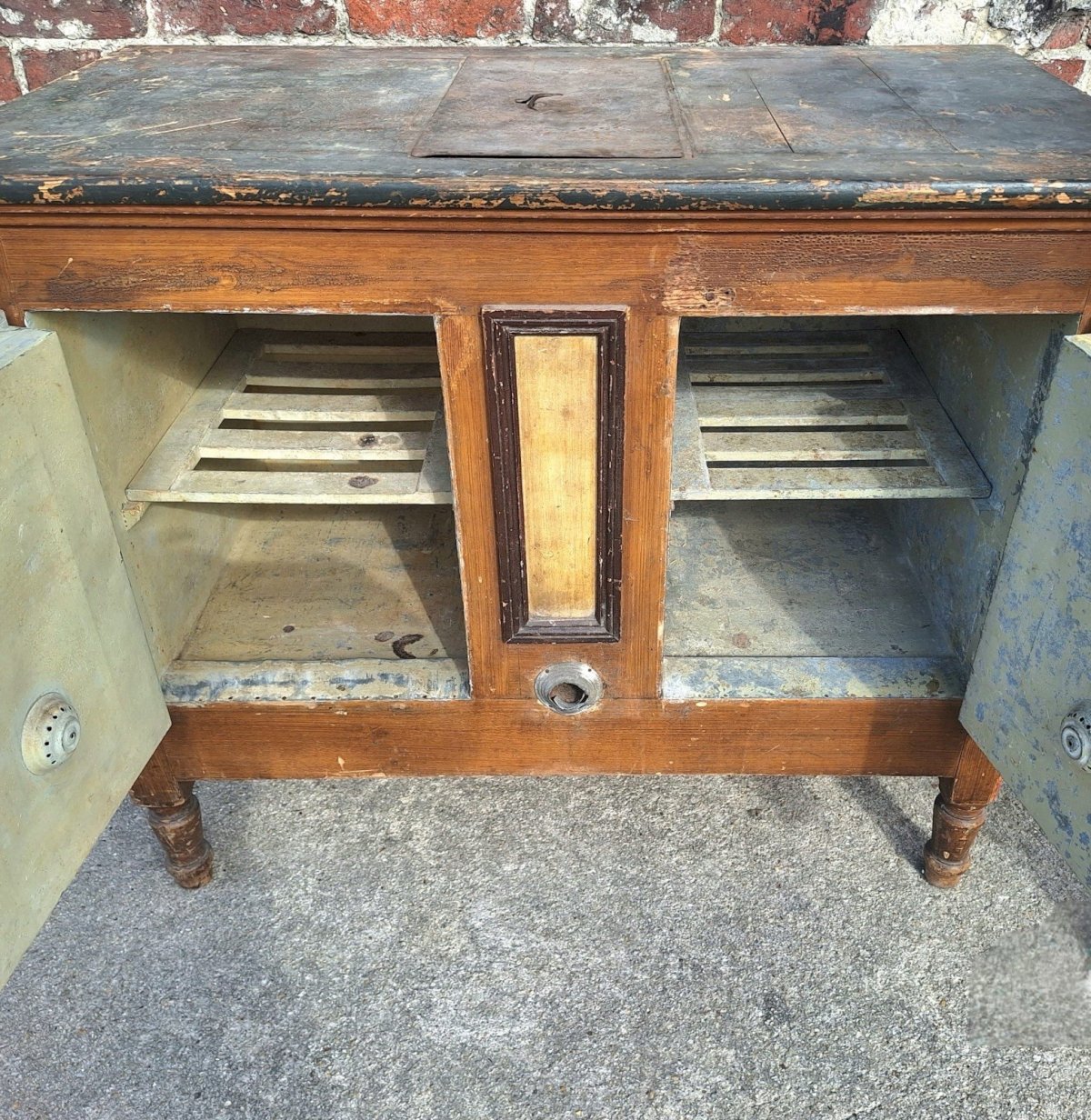 Thank you for writing to me if you want to make me an offer. Antique farmhouse refrigerator, unique pantry with an inimitable patina of time and use. Solid wood. Central part for ice blocks. Dimensions: 107x60xh90cm. Normal signs of use and age that give it this superb patina: varnish cracks, colorations and discolorations of the wood, bumps, chips, scratches, stains, and old insect traces. Original keys present but lock non-functional. Stable, heavy, and solid. Lots of charm and character. Pickup at my home or delivery possible via carrier (for example, €80 on the curb to Paris and the surrounding region, contact me for other destinations). Delivery times of 2 to 4 days are imposed and are therefore given purely as an indication. Campaign island counter fridge block Sub-type: Closed furniture.