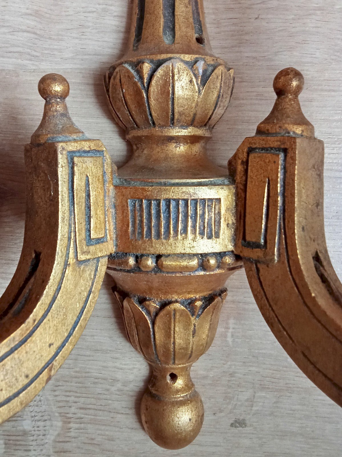 Pair of Vintage Empire Style Wall Sconces in Gilded Wood. Very nice, in good condition with small visible defects in the photos. Height 30.3 cm Width 19.5 cm Depth 9 cm Subtype: Sconce Material: Wood