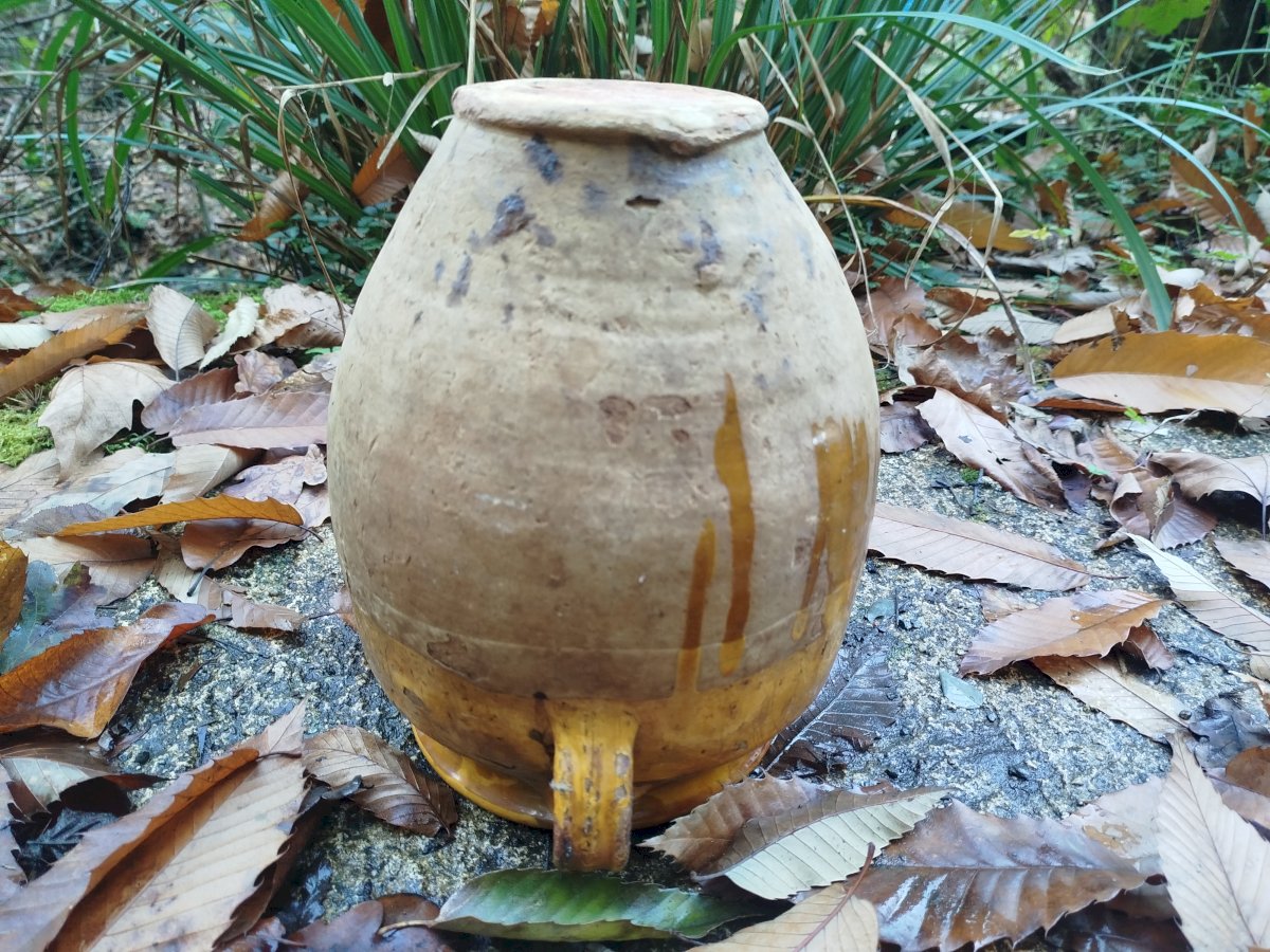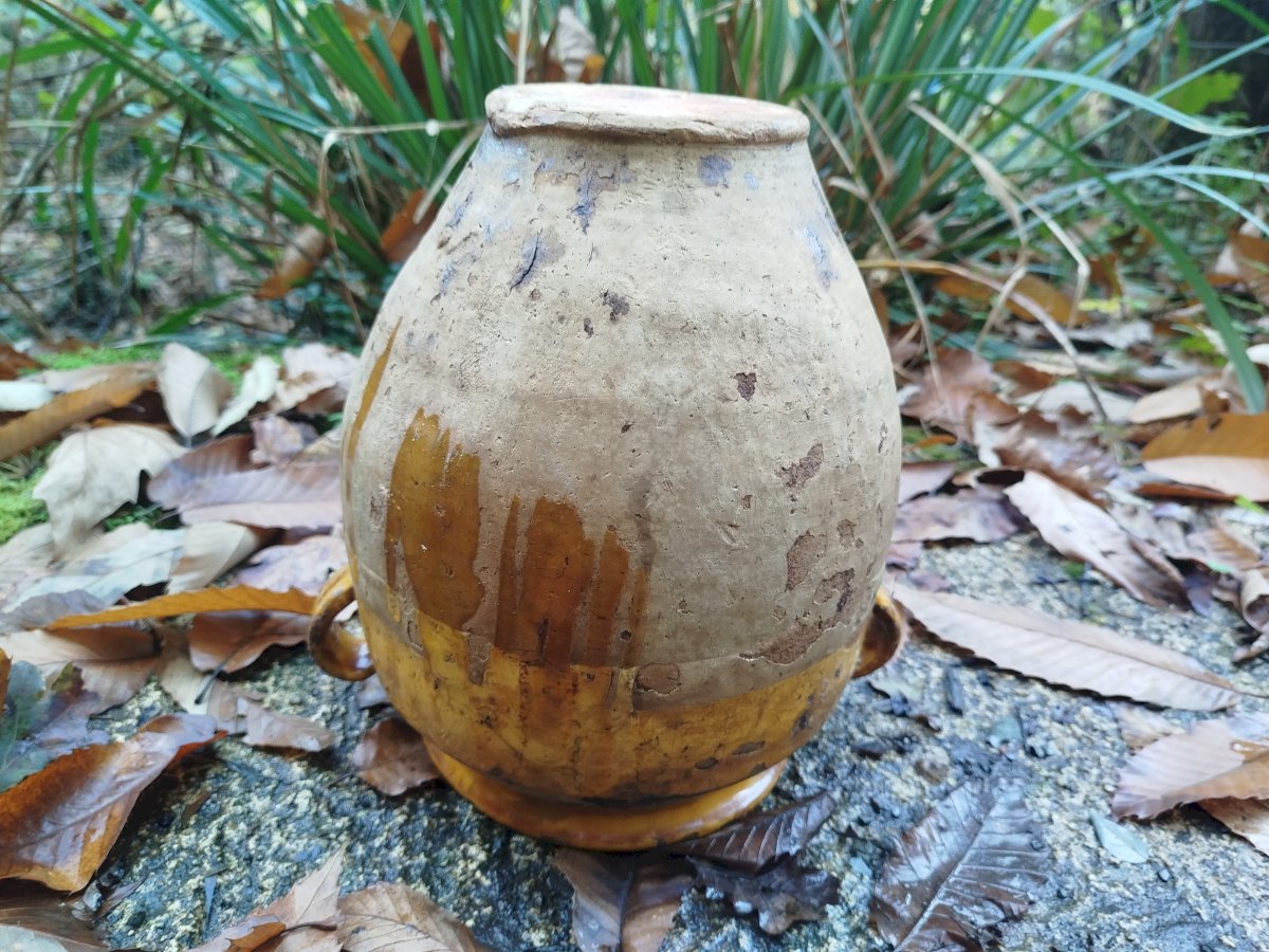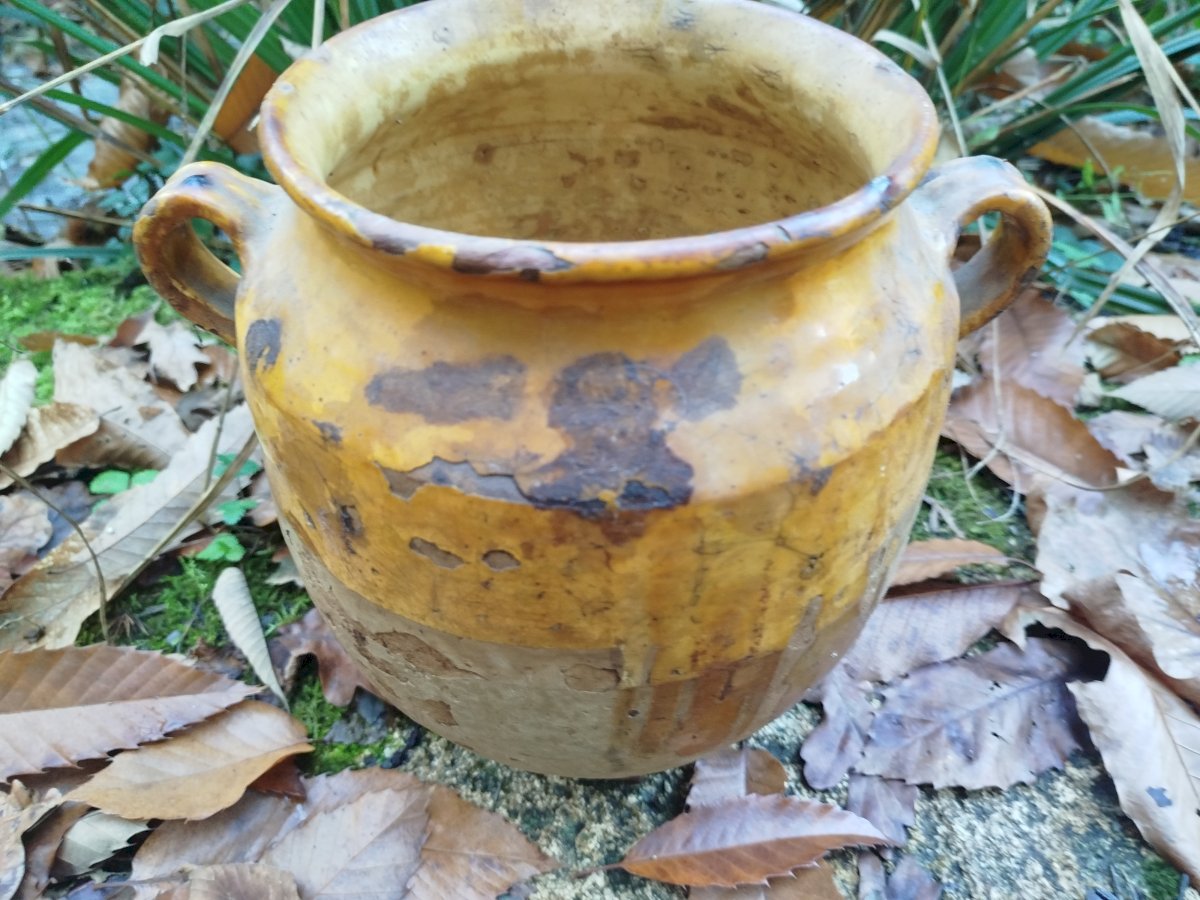 old grease pot, glazed yellow drip, pottery from southwest France (hole for flower pot use)