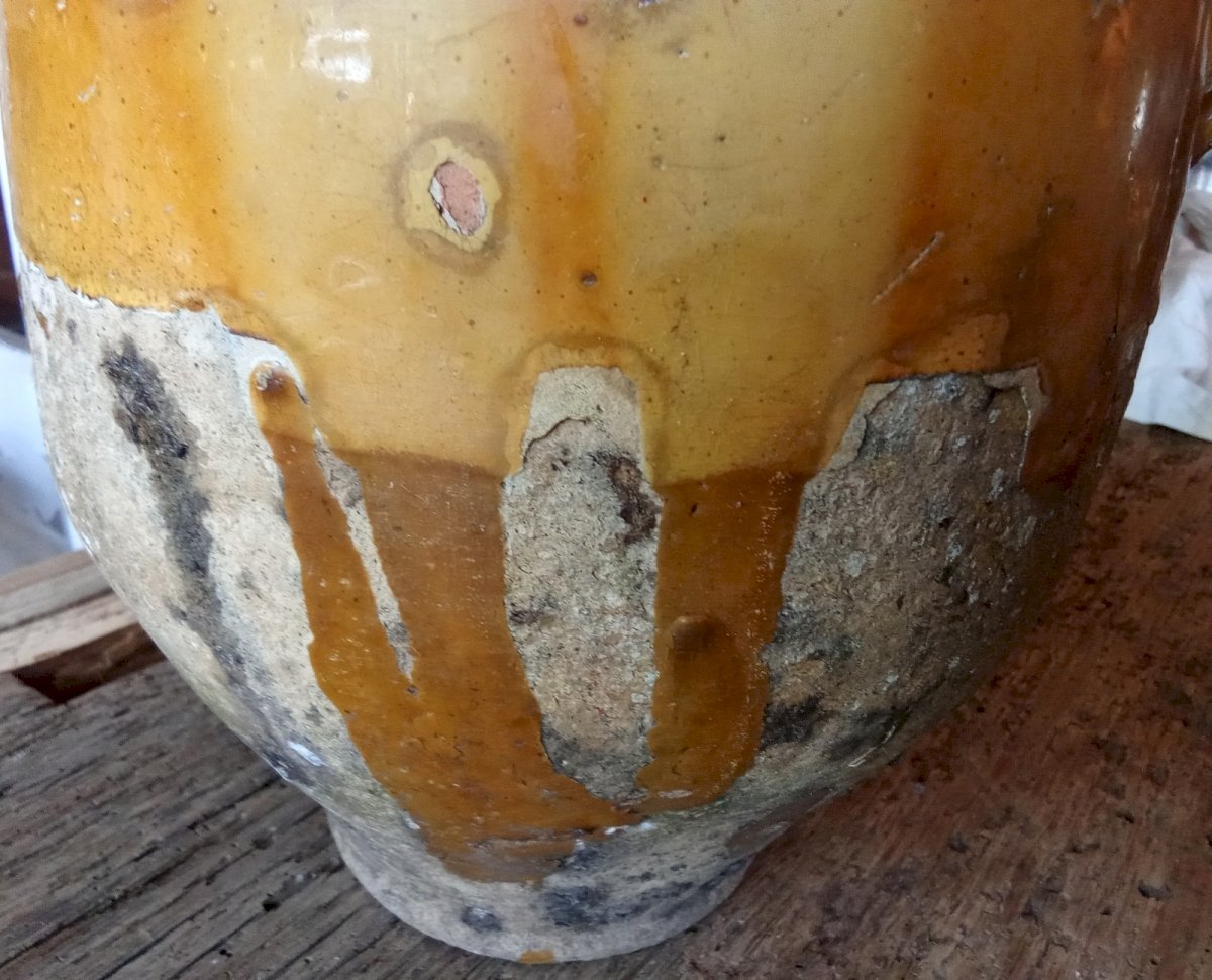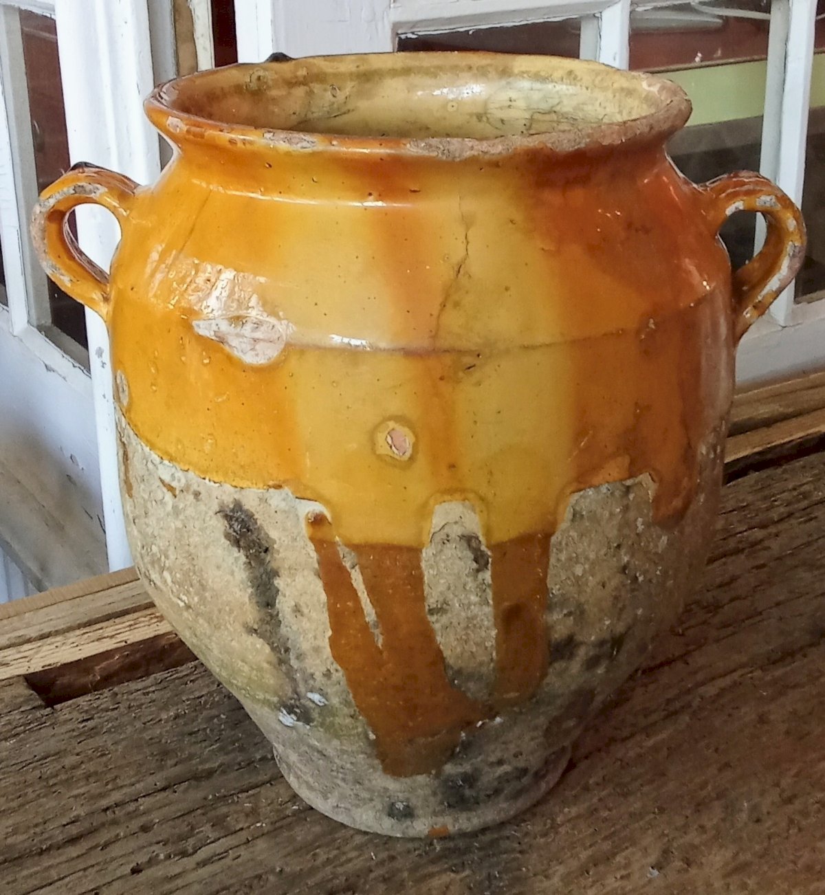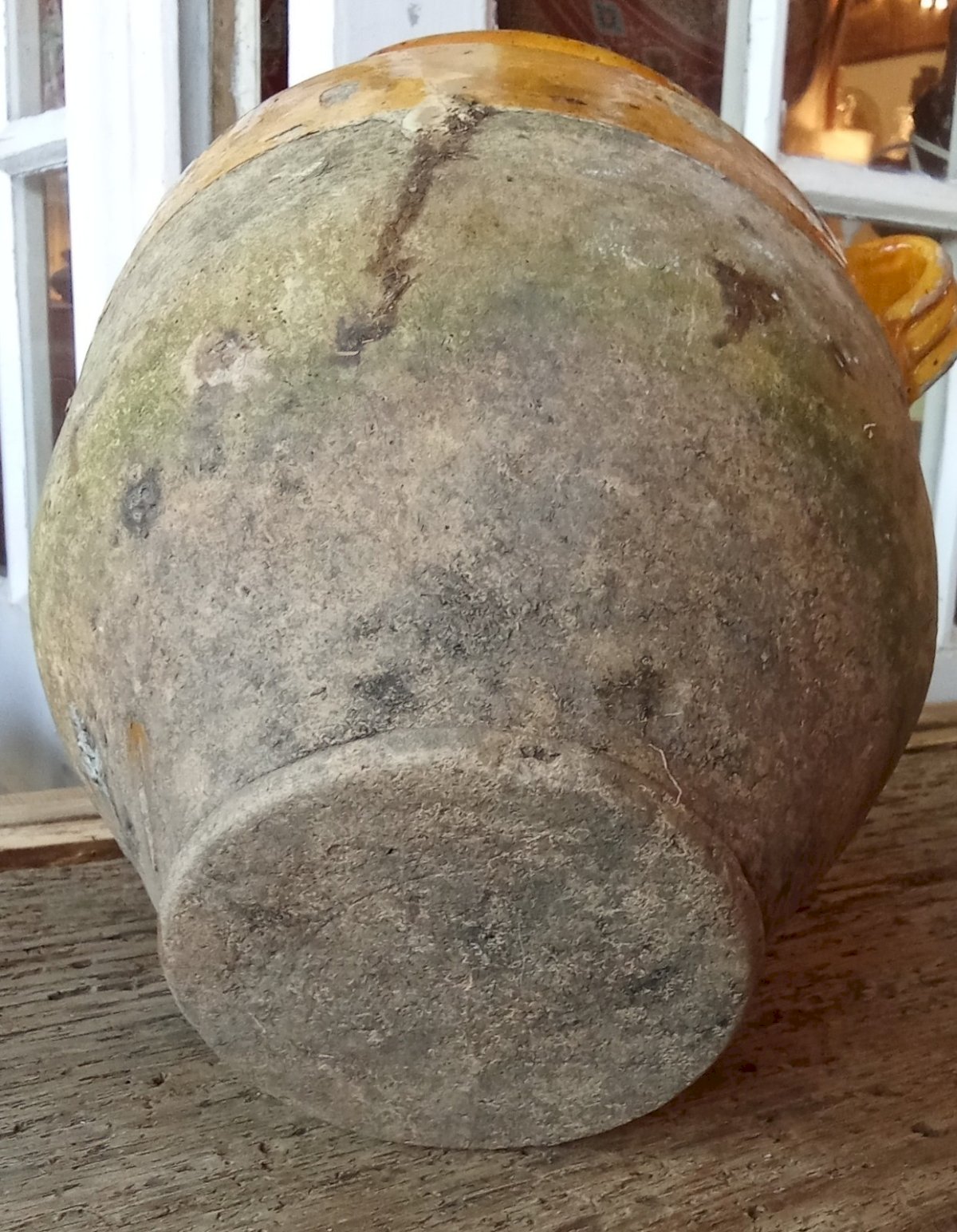 Antique Grease Pot from the South Earthenware Glazed Yellow Ceramic. Superb patina Old Shine on the rim see photo Height 25.1 cm Width with handles 24.7 cm Opening Diameter 18 cm Type: Craft Object Origin: France Period: 20th Century Design Material: Terracotta