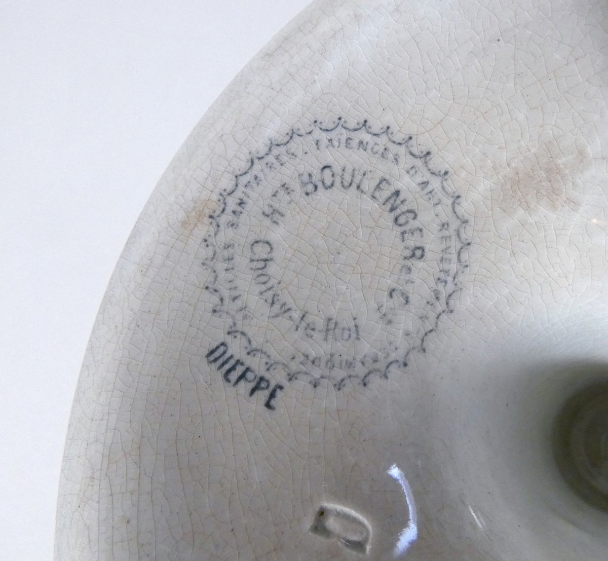 Ironware. Earthenware compote, "DIEPPE" model, Boulenger. Height: 10.5 cm. Diameter: 22 cm. In good condition. Some stains. Chipped earthenware at the bottom (cooking defect). Very nice patina, subtle color of a saturated blue. Color between two waters typical of Ironware dishes. Condition: Used: Item has been used. Item shows some superficial signs of wear, fully operational and functioning properly. It may be a display model or an item returned to the store after a short period of use. Possible imperfections. Type: Bowl Material: Ceramic Country of origin: Metropolitan France.