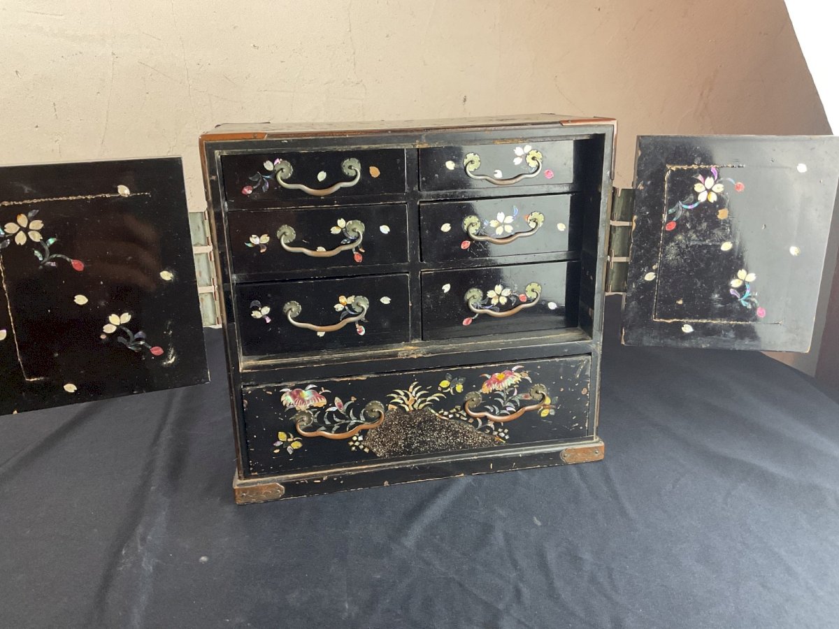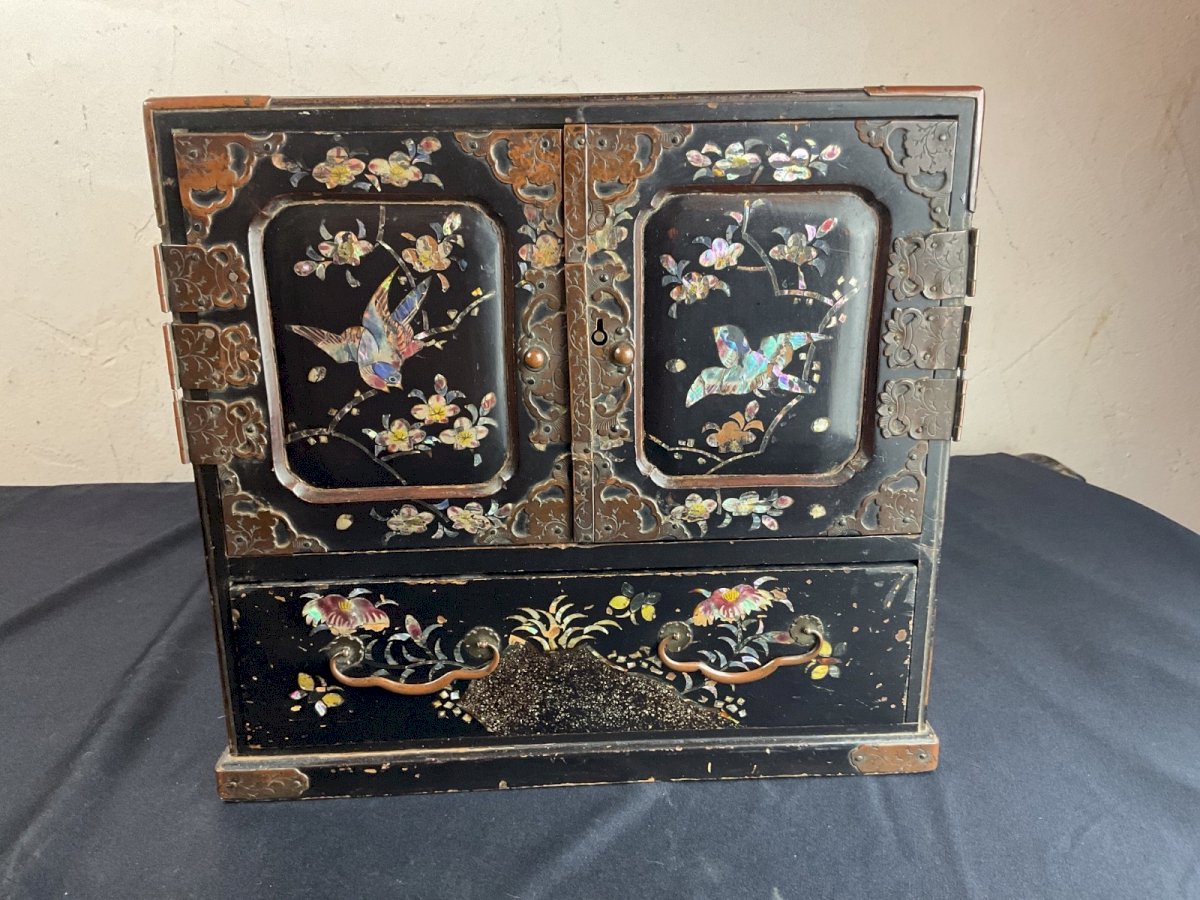 Antique Japanese lacquered travel cabinet, Tansu, Meiji period 19th century. Needs veneer restoration due to missing parts. Height: 22 cm Width: 24.5 cm Depth: 14 cm Authenticity: Original Type: Showcase item, Decorative Origin: Asia Material: Wood Style: Antiquity