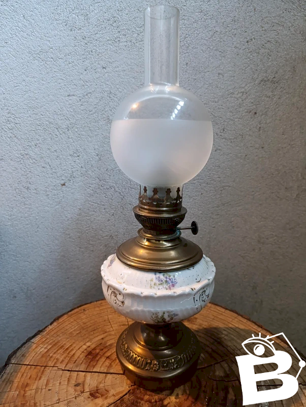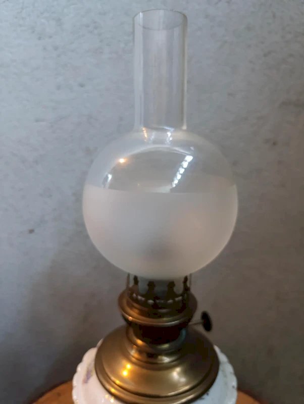 Old oil lamp with glass globe, enamelled paint, in good condition