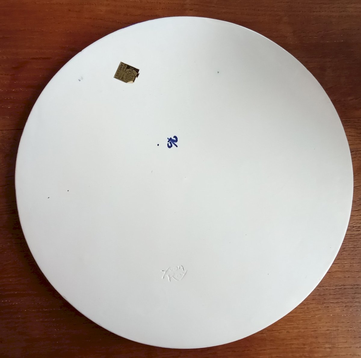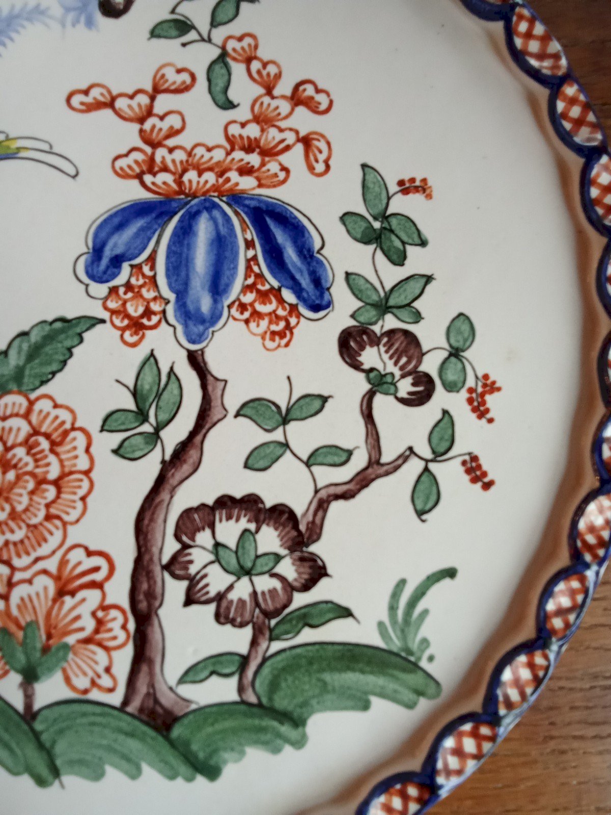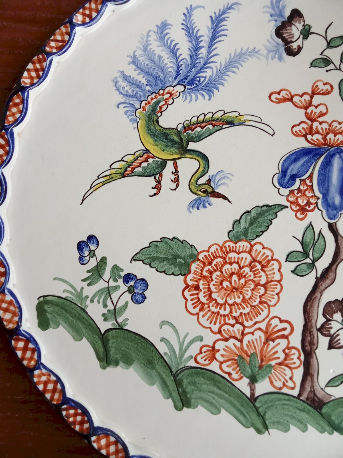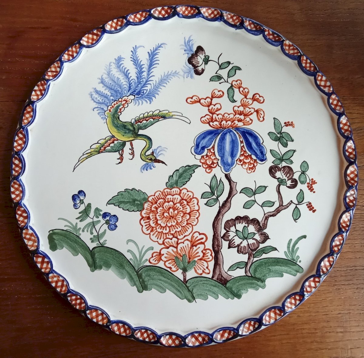 Ancient large ceramic plate Signed Yvon Roy Very nice decoration with a bird of paradise, exotic flowers, and peony Crosshatch border 20th-century ceramic artist. Good condition Diameter 33.5 cm