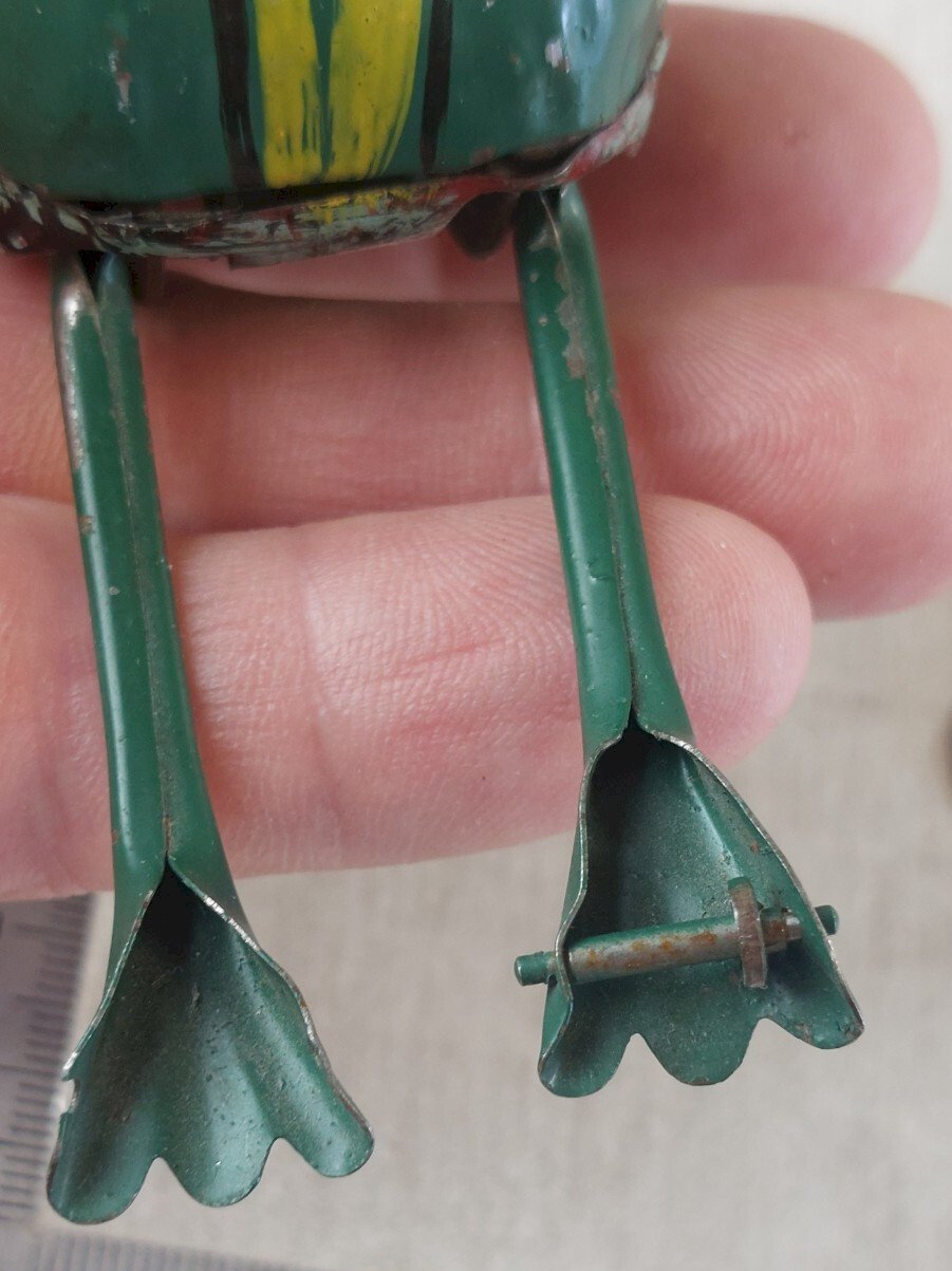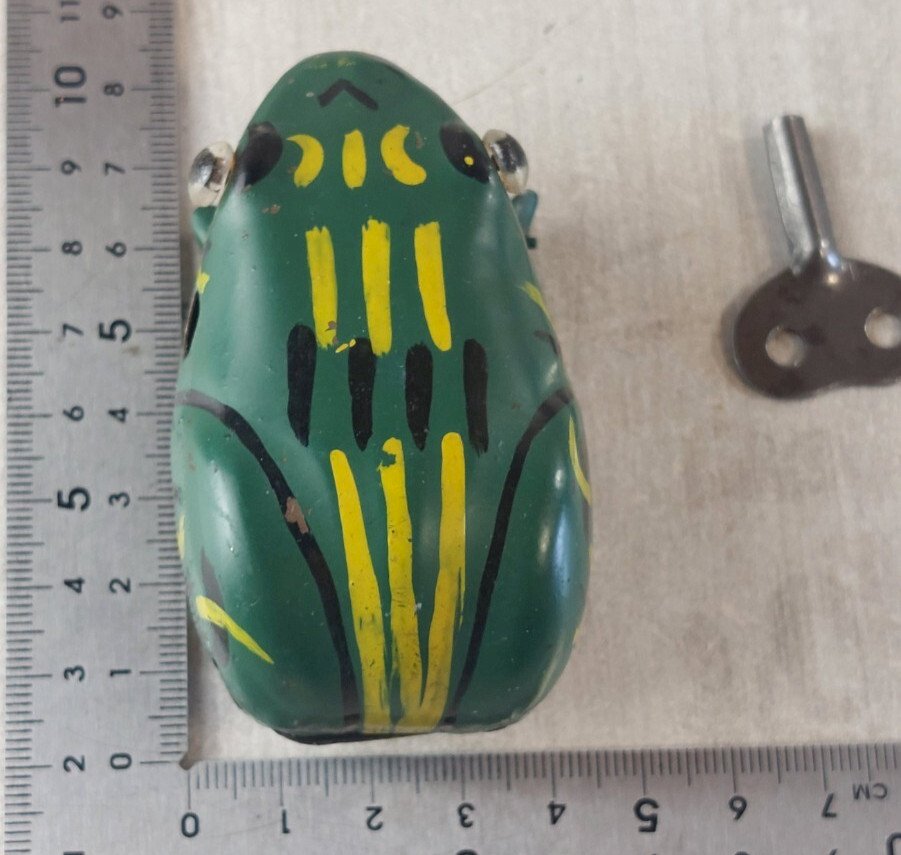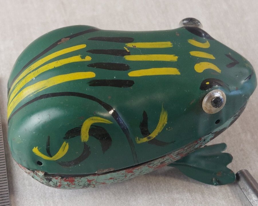 Old mechanical toy, key-wound frog, tin in good condition, the mechanism does not work but is not jammed, unmarked, length 7.5 cm, see photos. Check out my other items! Reduced shipping costs for combined purchases. Condition: Used, item has been used. Any imperfections. Type: Mechanical Toys Material: Tin Miniature Toy: Animals