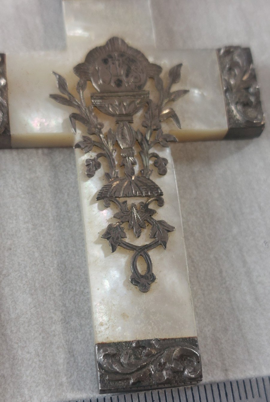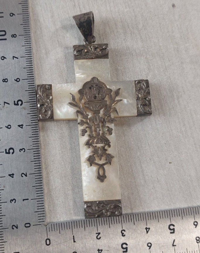 Old medal / pendant, cross, made of mother-of-pearl and silver in good condition with two hallmarks on the bail total dimensions of the cross 7.2 cm x 4.7 cm total weight 28.54 g see photos Check out my other items! Reduced shipping costs for combined purchases Condition: Used Item has been used. any imperfections. Type: Christianity Subtype: Medal, Pendant Material: Mother-of-pearl