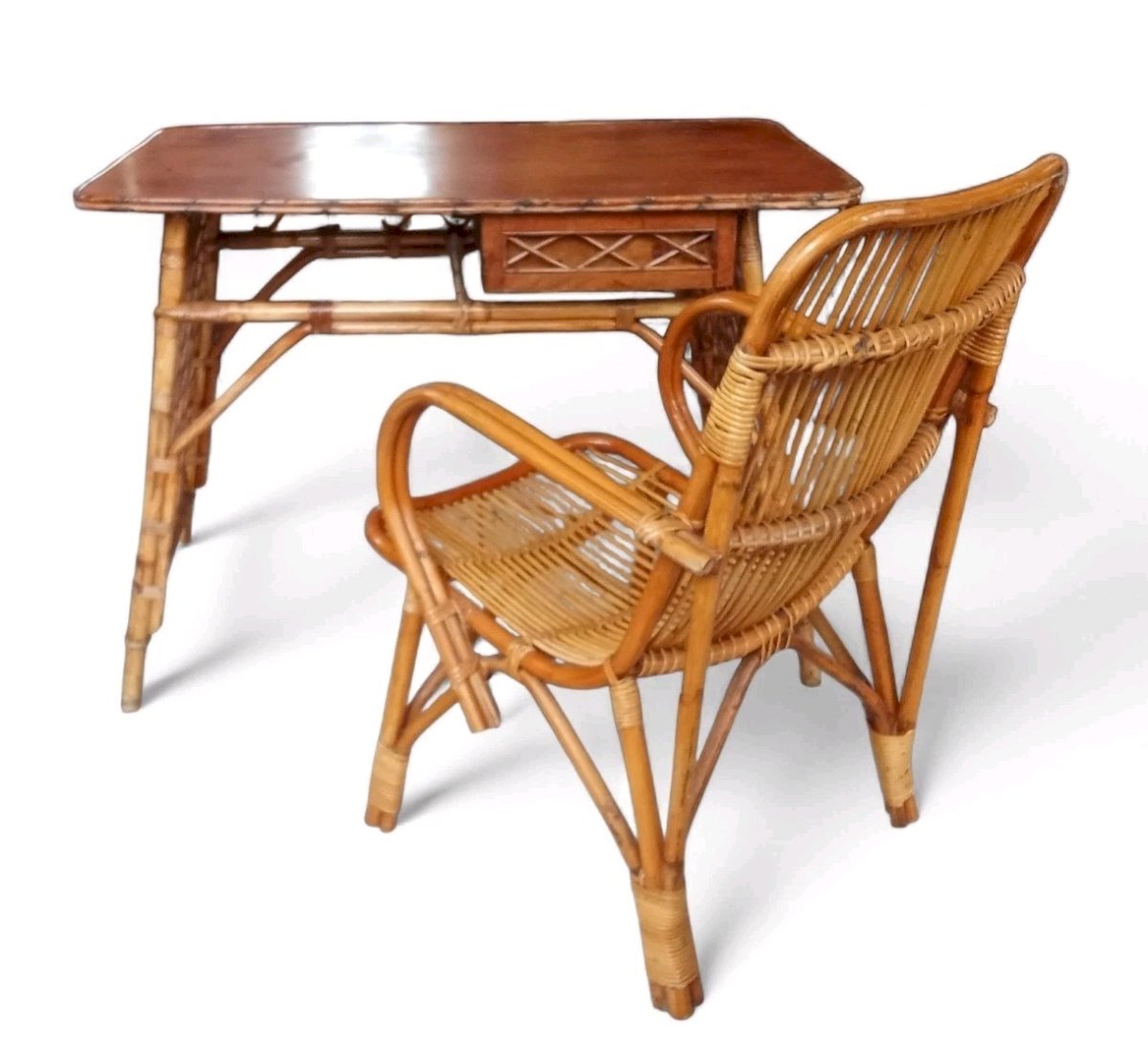 Vintage Desk and Chair in Rattan from the 1970s. Desk with 1 drawer in good condition, with a small, barely visible defect on the back corner, see photo. The chair is missing a small piece of rattan, also barely visible, see photo. Desk height 75 cm, dimensions 102 cm x 62 cm. Chair height 87.2 cm, seat height 41 cm, width from arm to arm 52.5 cm. Delivery possible by carrier. Contact me for the rate based on your region. Type: Table, Style: 1970.