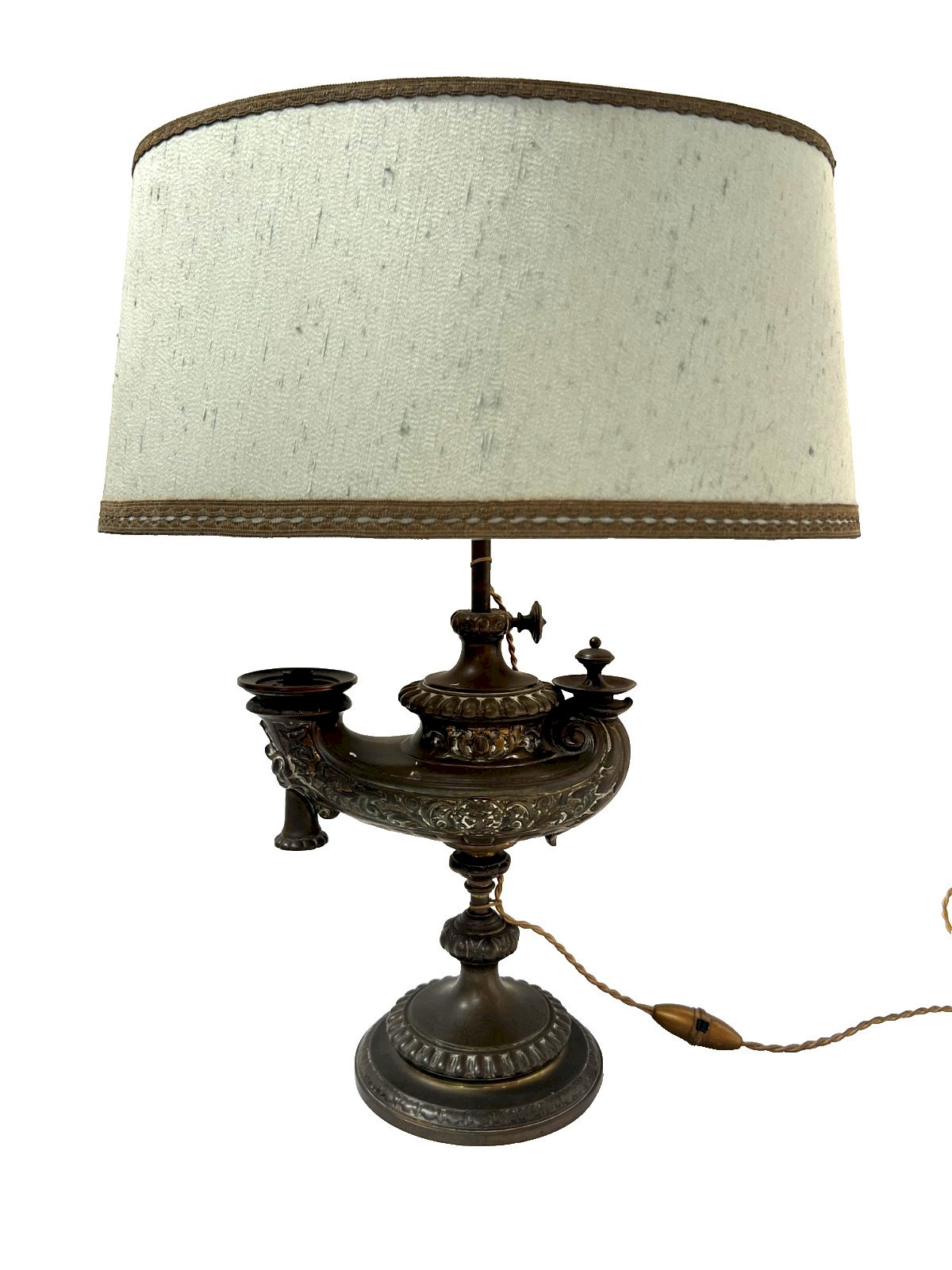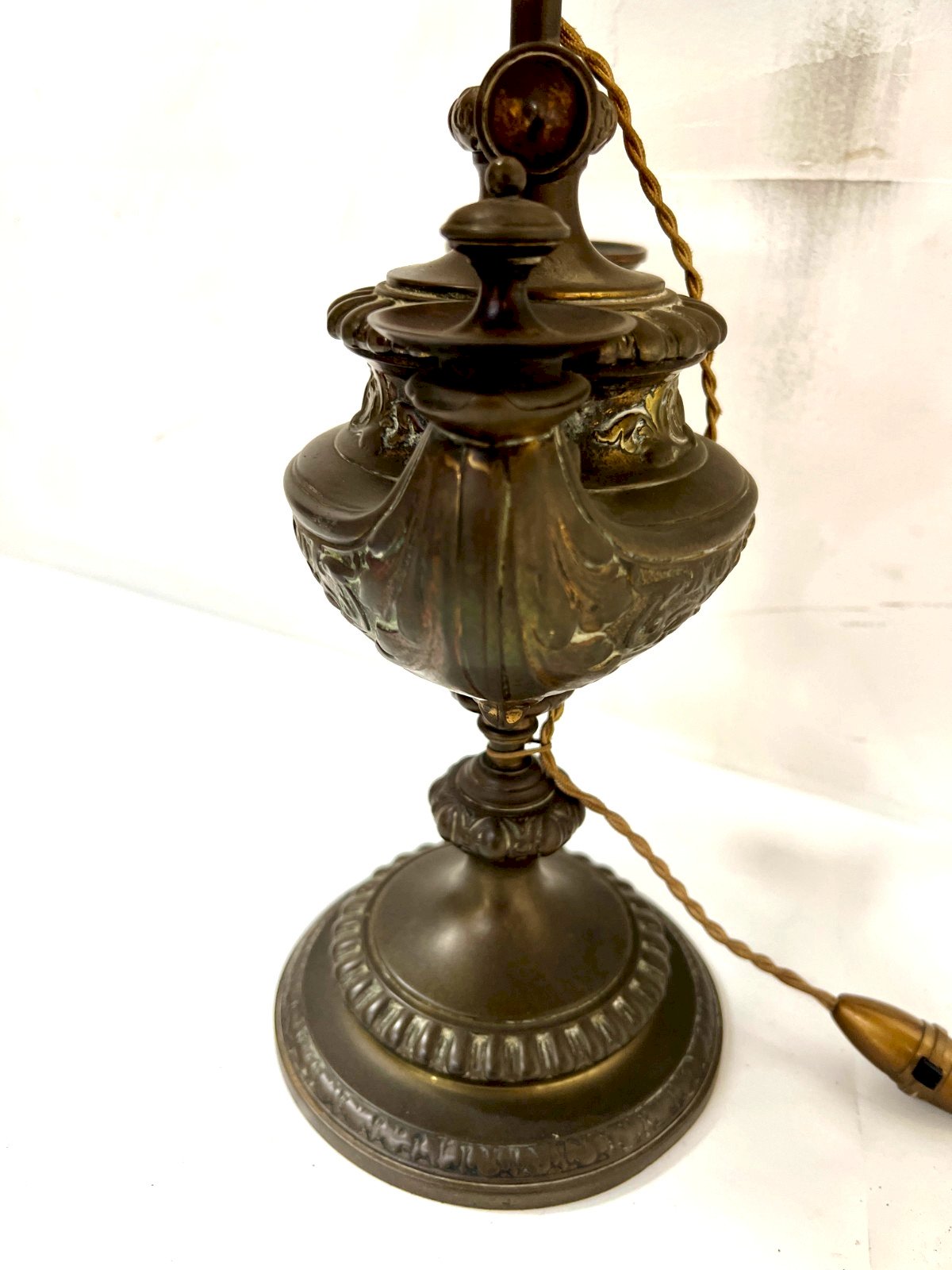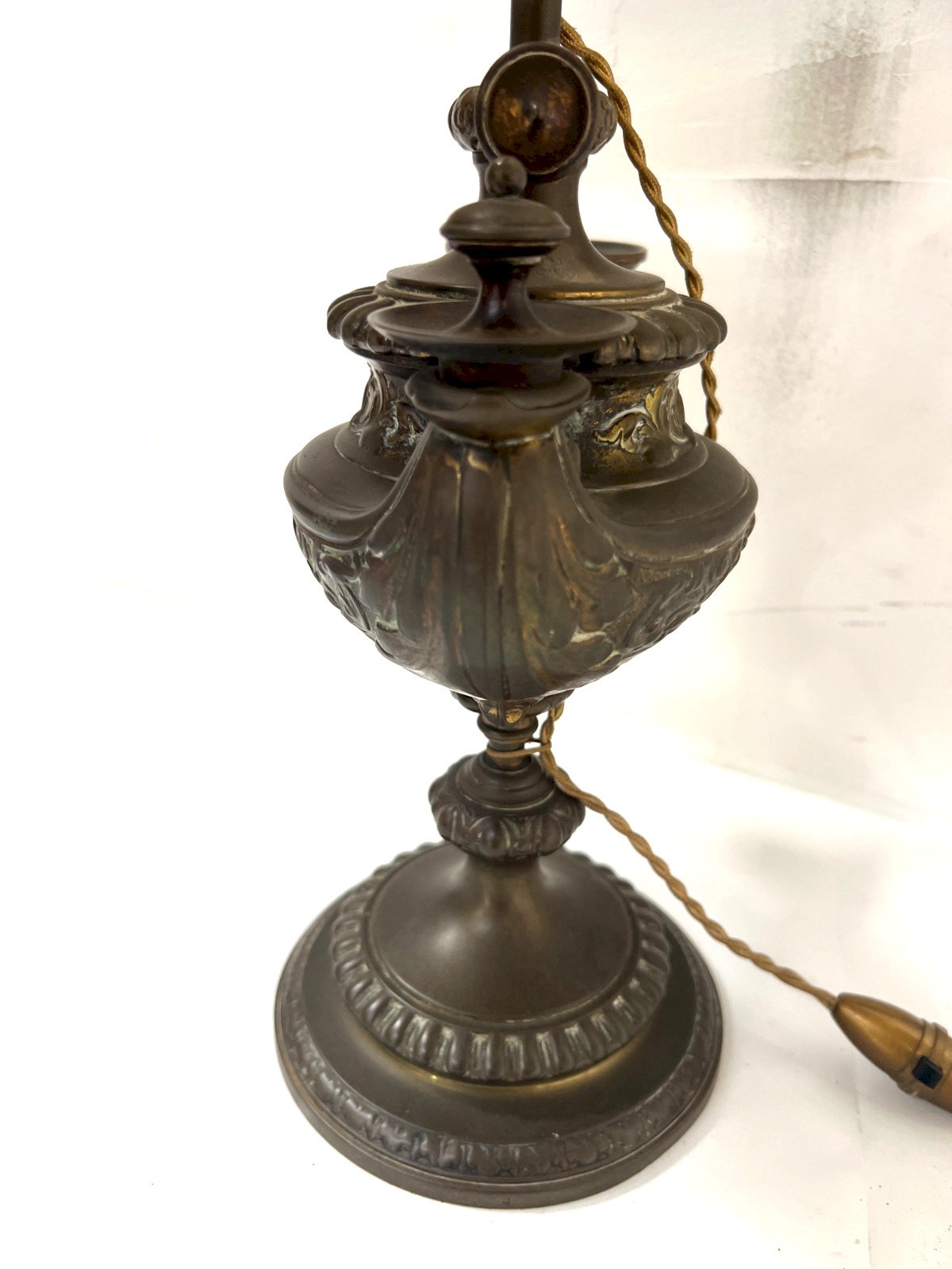 Antique patinated bronze pedestal oil lamp Model with a decor of flutes and acanthus leaves Lamp converted to electricity Good condition Sold without the lampshade Dimensions H 57 x L 25 x 14 cm Period 19th century Type: Table Art, Kitchen Origin: France Country of manufacture: France Material: Bronze Style: Napoleon III