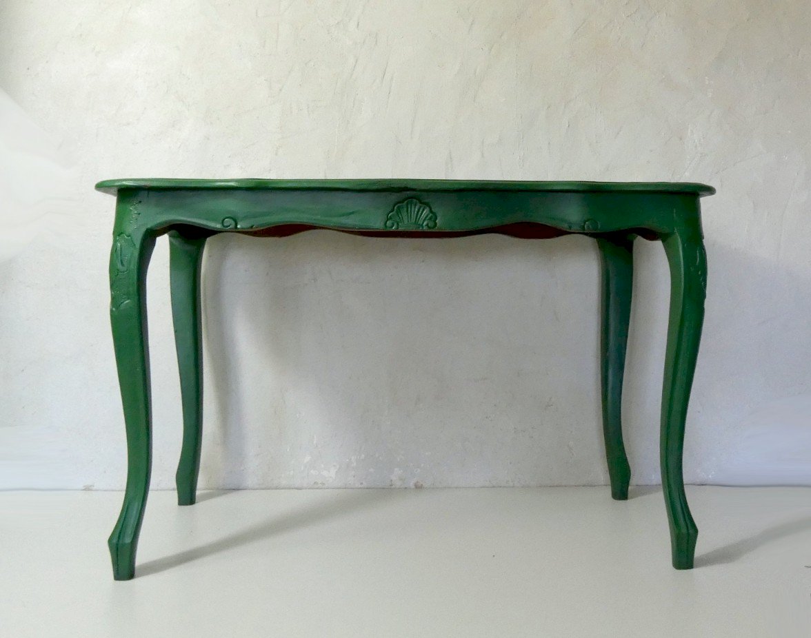 Vintage painted wooden coffee table. Impeccable structure, no play in the joints. Lovely carved details and curved, elegant legs. Painted in green. Height: 45.5 cm. Width: 77.5 cm. Depth: 42.5 cm. This table is in very good condition, with superficial signs of use and aging: scratches, color variations on the top, and some missing paint in places, especially on the edges (see photo details). Type: Table Material: wood