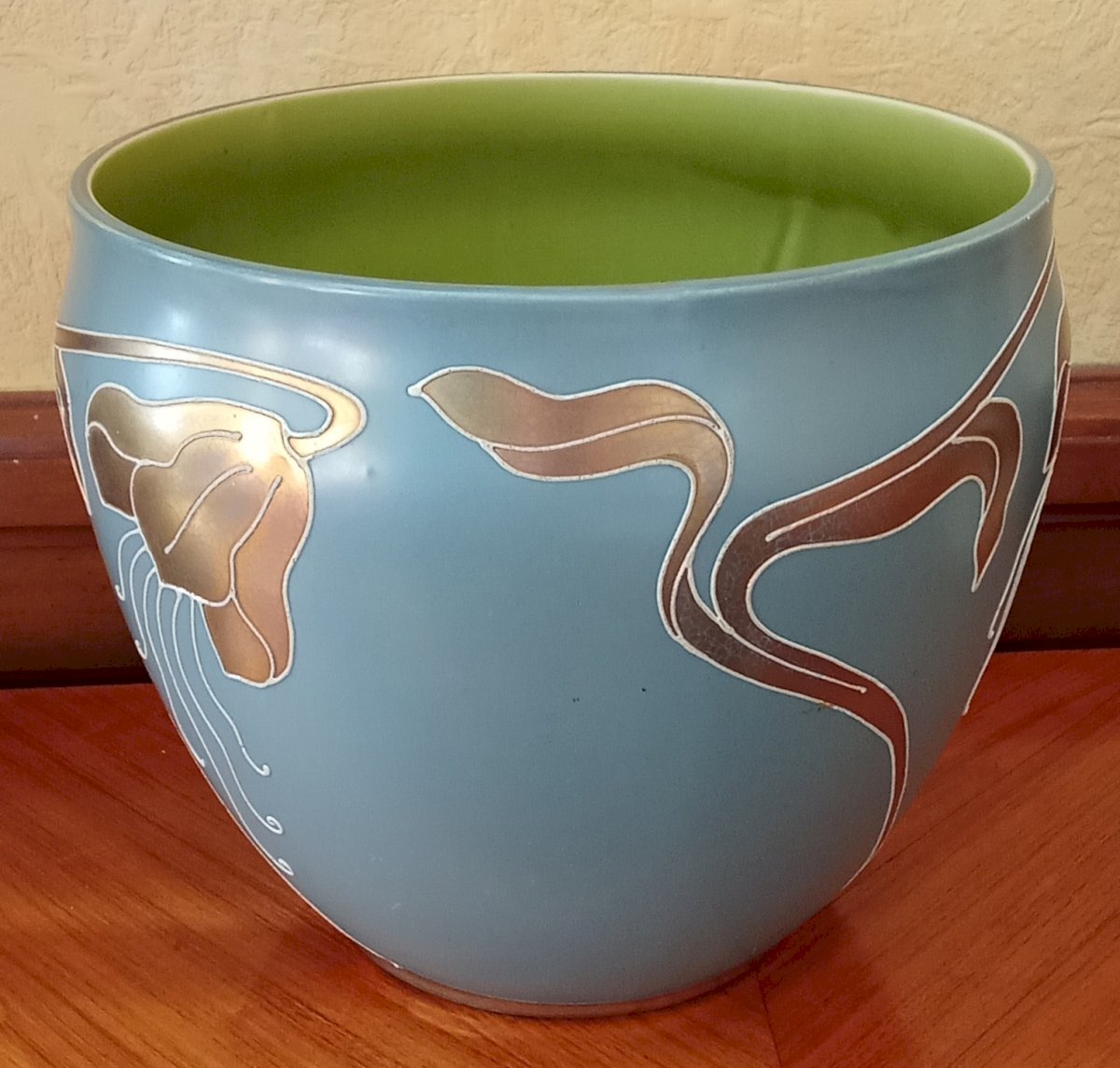 Old ceramic planter cache pot Art Nouveau period late 19th century. Sarreguemines France Golden floral decoration Very beautiful piece Numbered in good condition Height 20.2 cm Opening diameter 22.7 cm