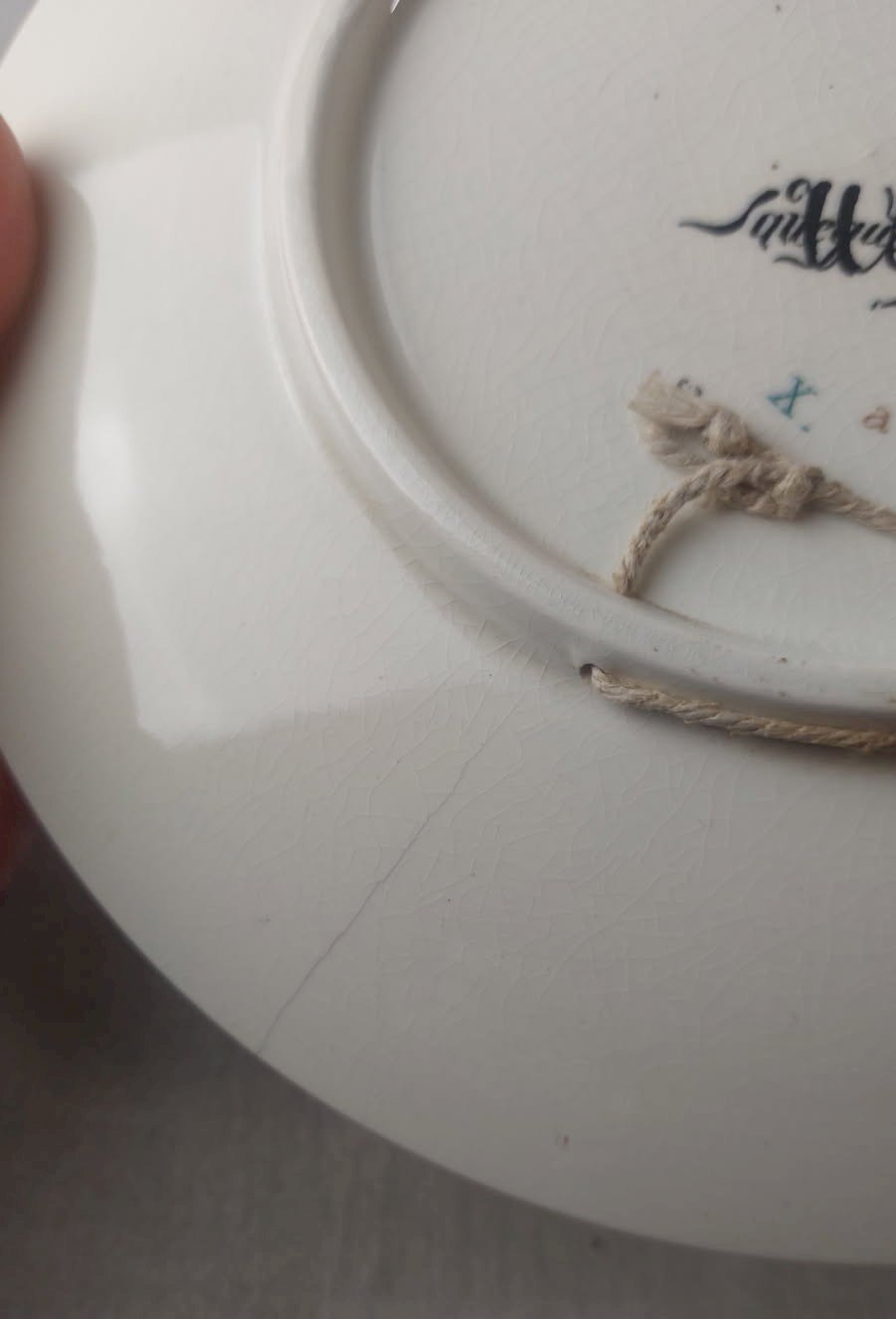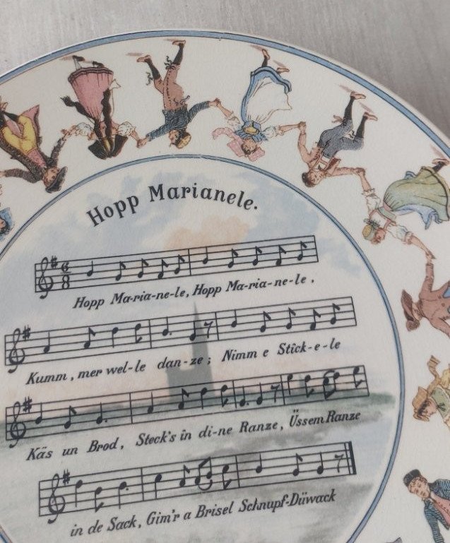 Old plate, Alsatian song decoration, made of Sarreguemines ceramic "Hopp Marianele" in good condition, no chips, one crack on the back, diameter 22 cm, see photos. Check my other items! Shipping costs reduction for combined purchases. Country of origin: France.