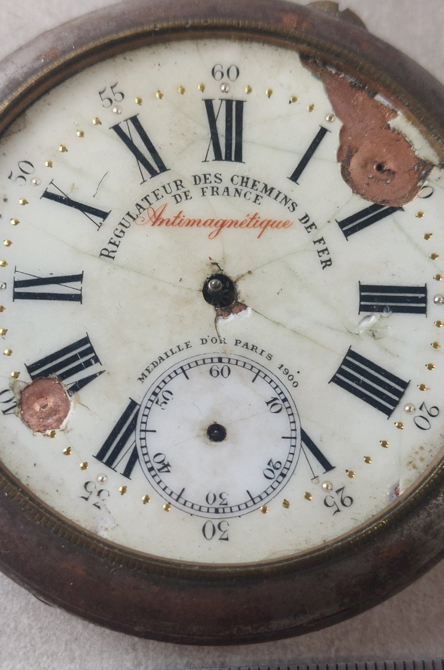 Old regulator pocket watch of the French railways in average condition, lacks hands, glass, crown, push button, missing enamel on the dial does not work marked Regulator of the French railways, Gold medal of Paris 1900, Double plate anchor, visible lever, 15 rubies width without crown 6.8 cm weight 169 gr see photos Check out my other items! shipping costs reduction for combined purchases Condition: Used - Good condition This item has imperfections and visible signs of wear, such as scratches, dents, broken or missing parts. All imperfections must be shown and described in the seller's listing. Type: Pocket watch Department: Adult unisex