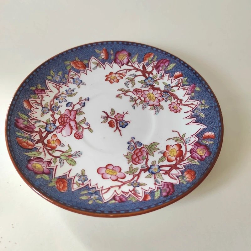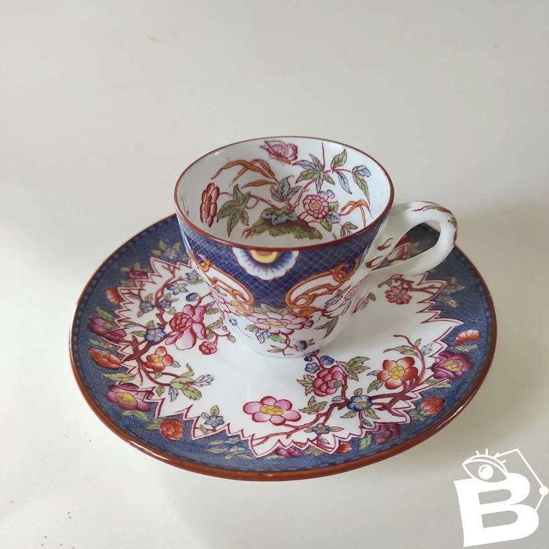 1 coffee cup with its saucer in porcelain from the French manufacture Sarreguemines, Minton decoration in blue. The pieces are stamped on the back with a green crest seal featuring 3 martlets and in relief.